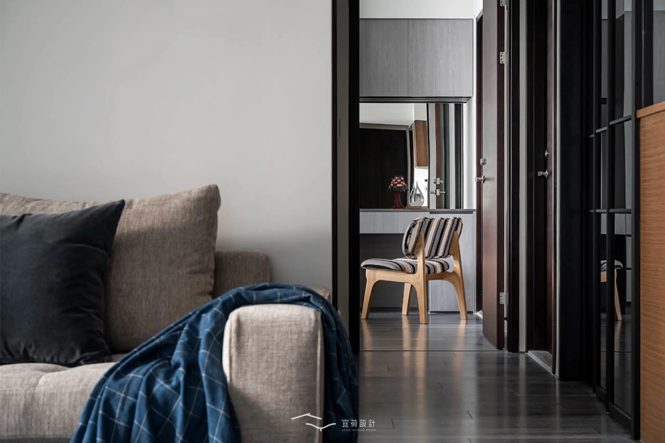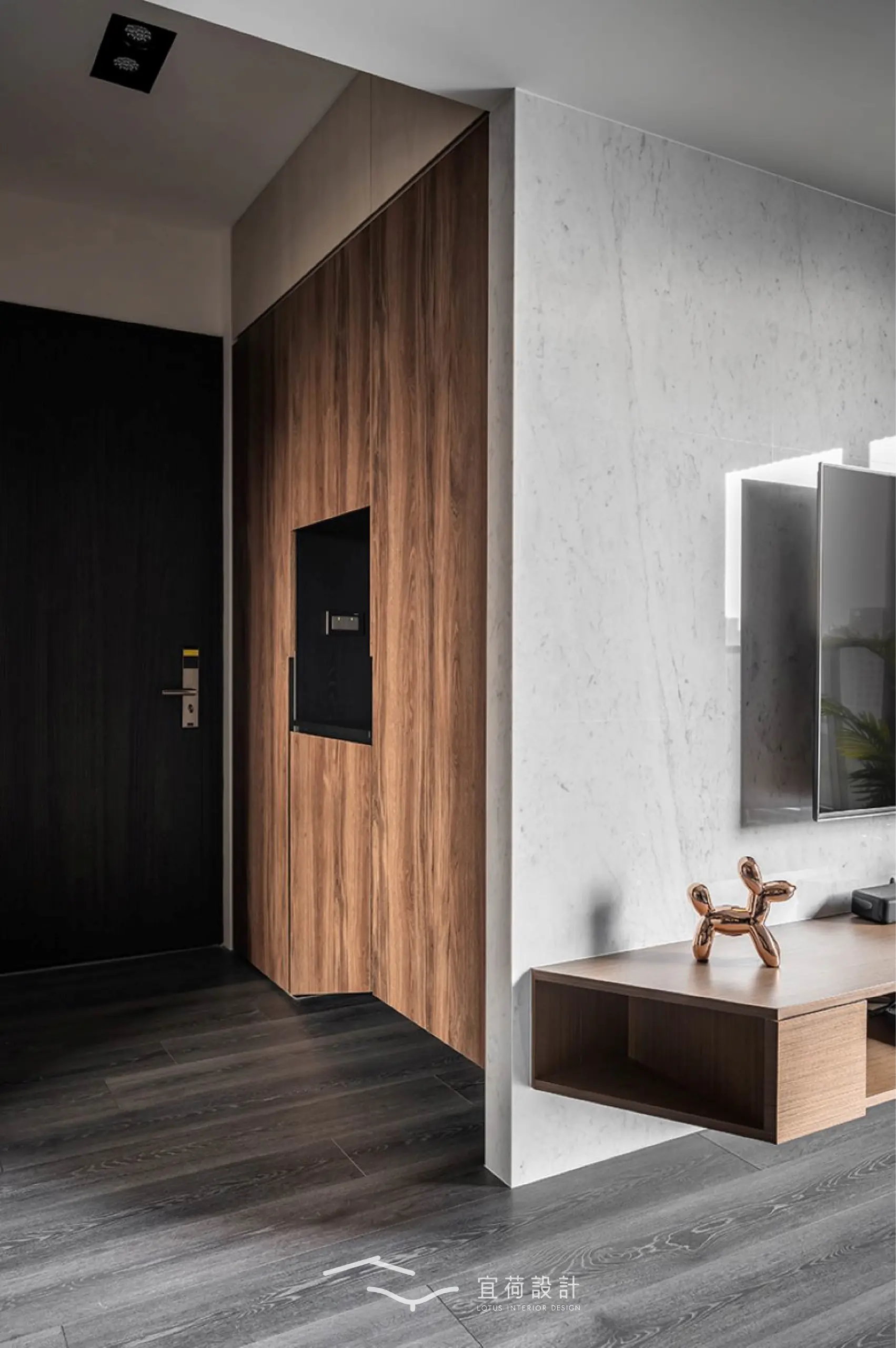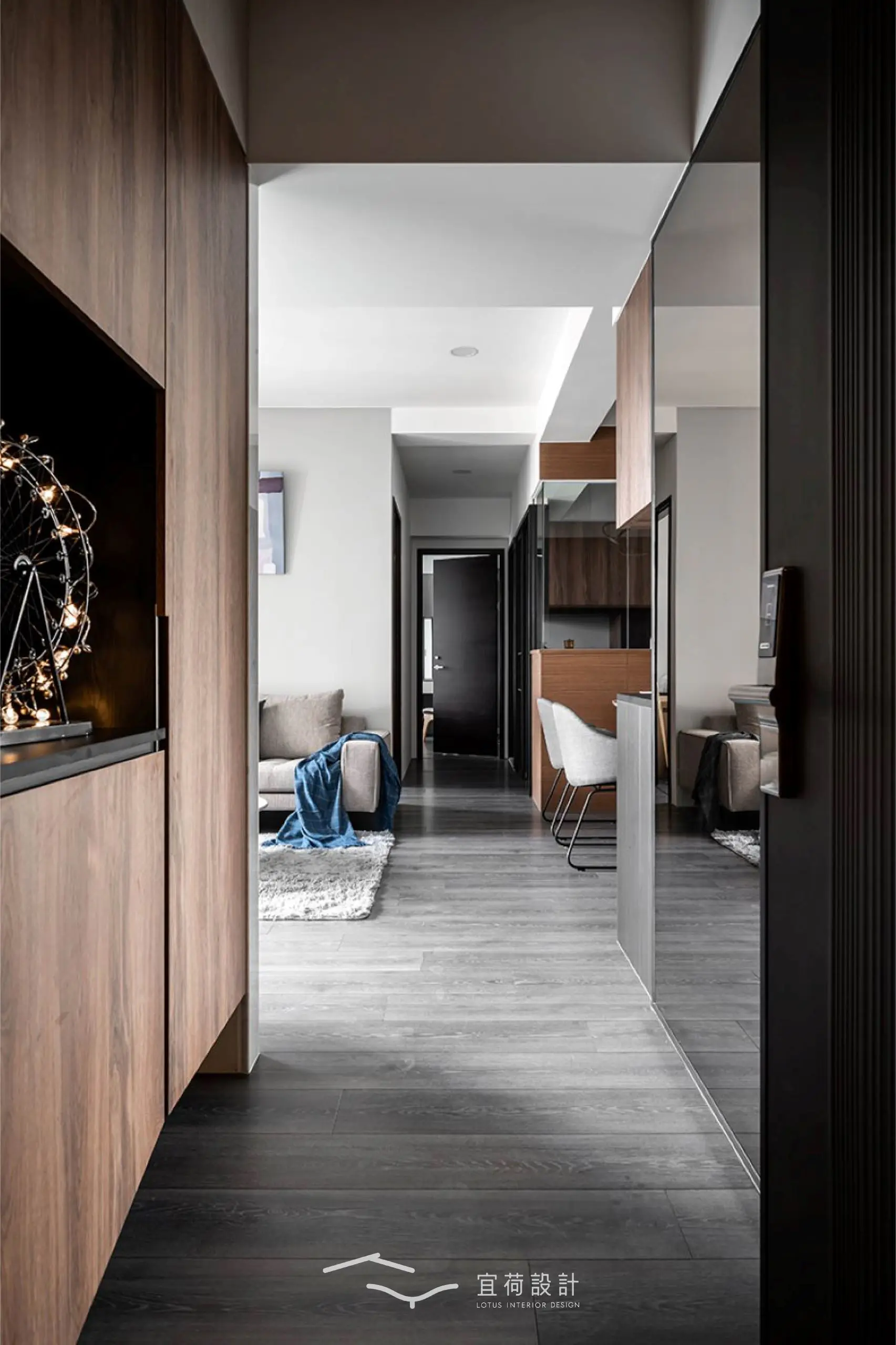 步入室內,玄關以櫃體巧妙包覆電箱,並以一整面茶鏡延展光影與視覺,悄悄放大空間的第一印象。
