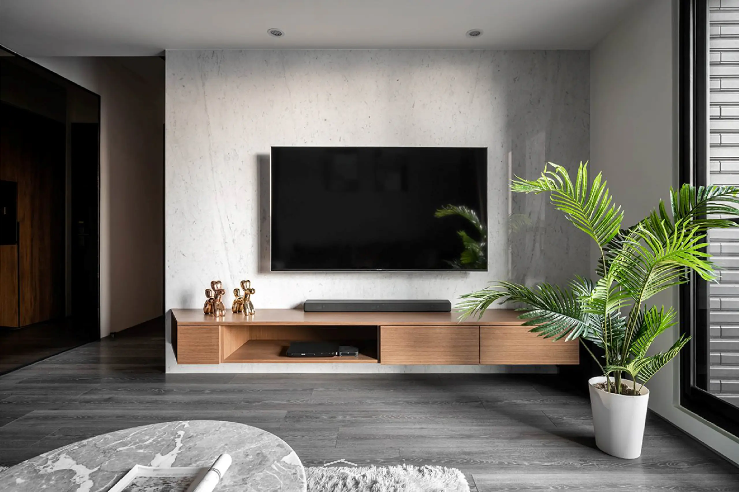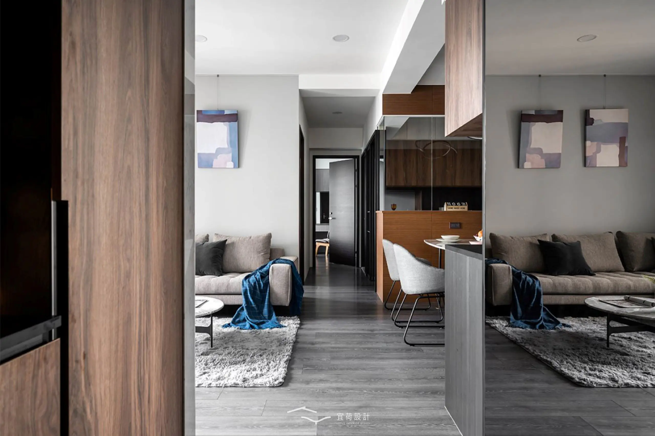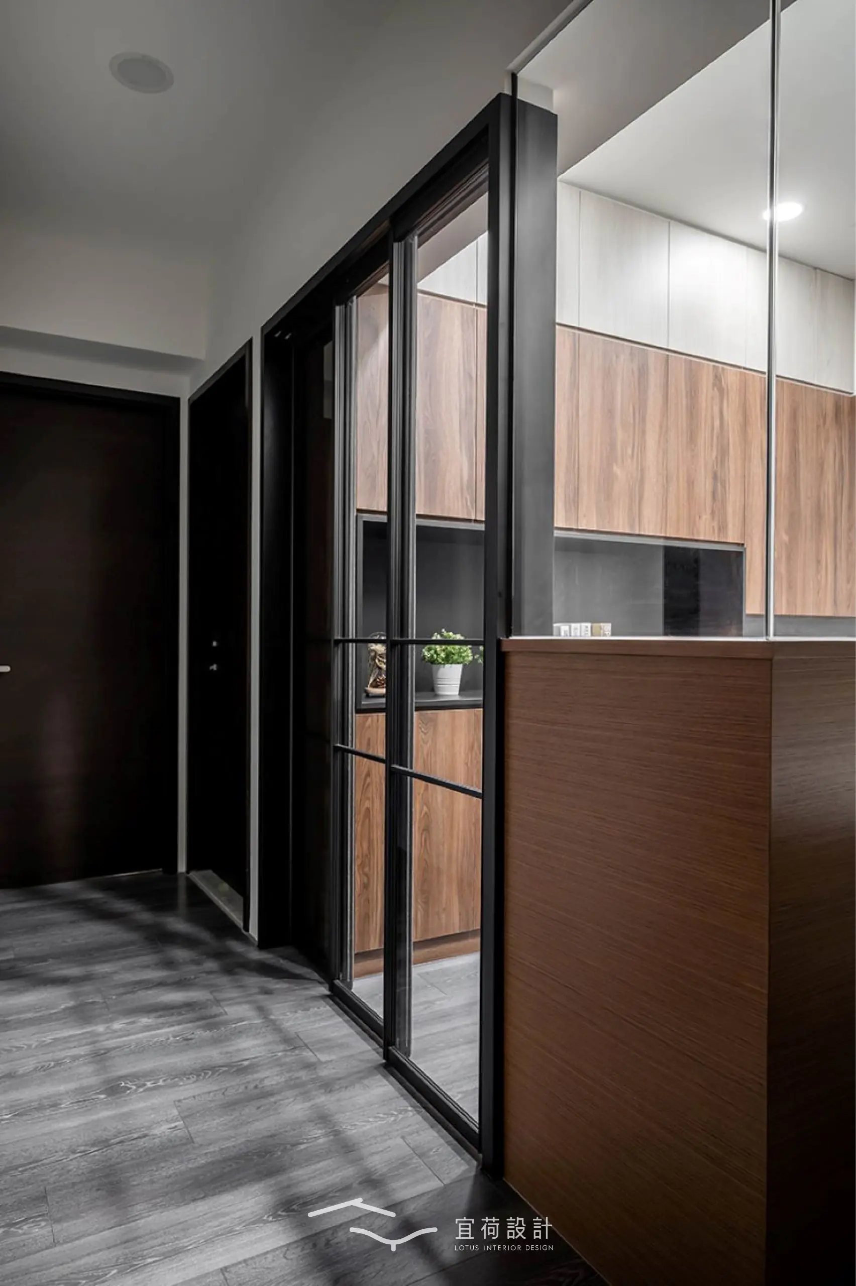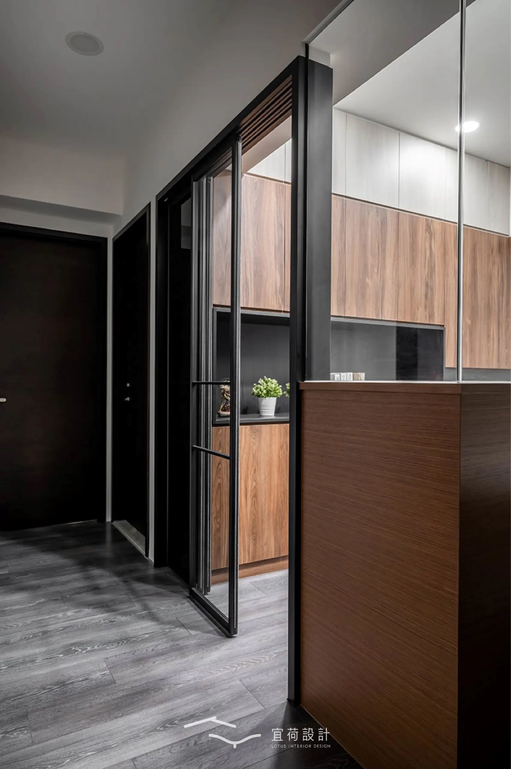 步入室內,玄關以櫃體巧妙包覆電箱,並以一整面茶鏡延展光影與視覺,悄悄放大空間的第一印象。