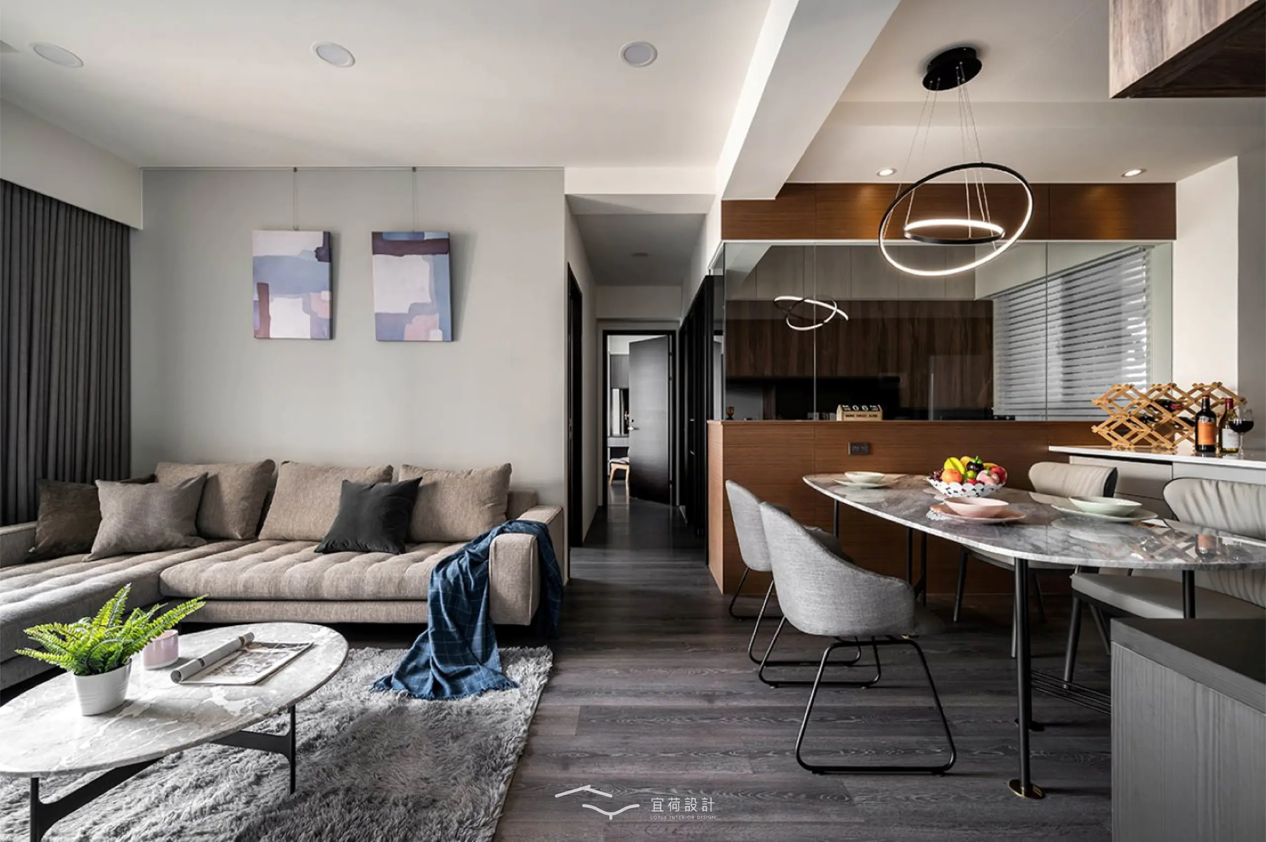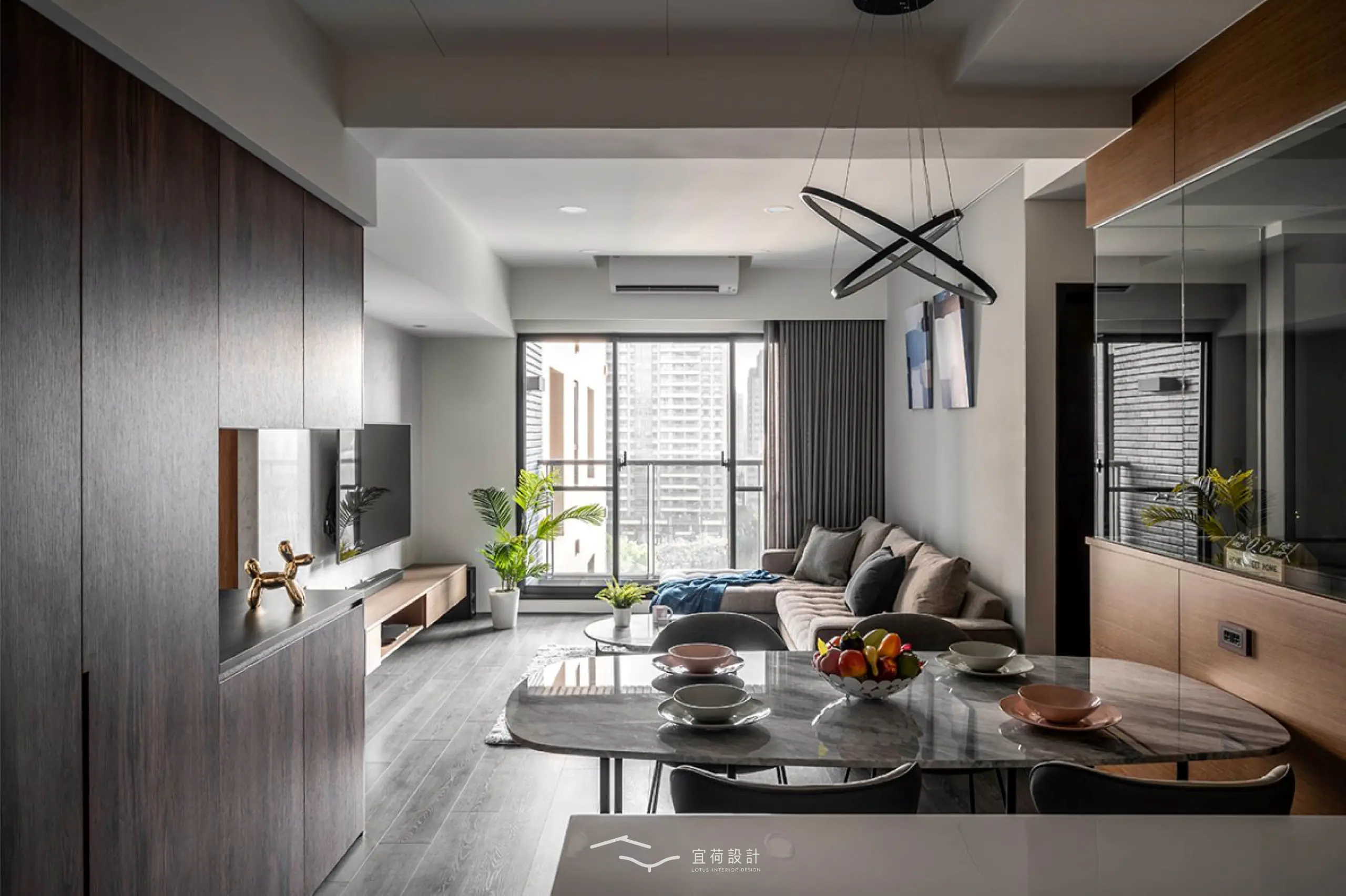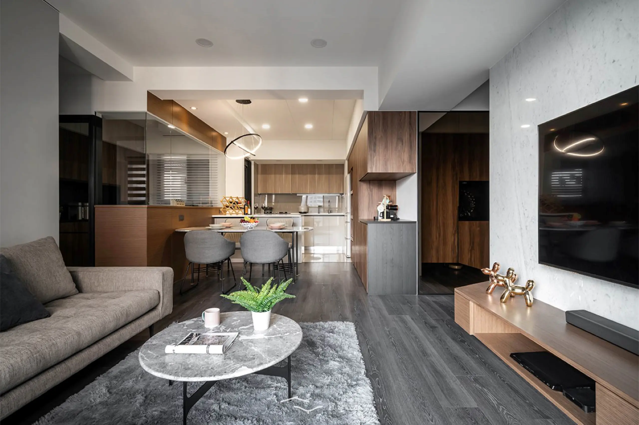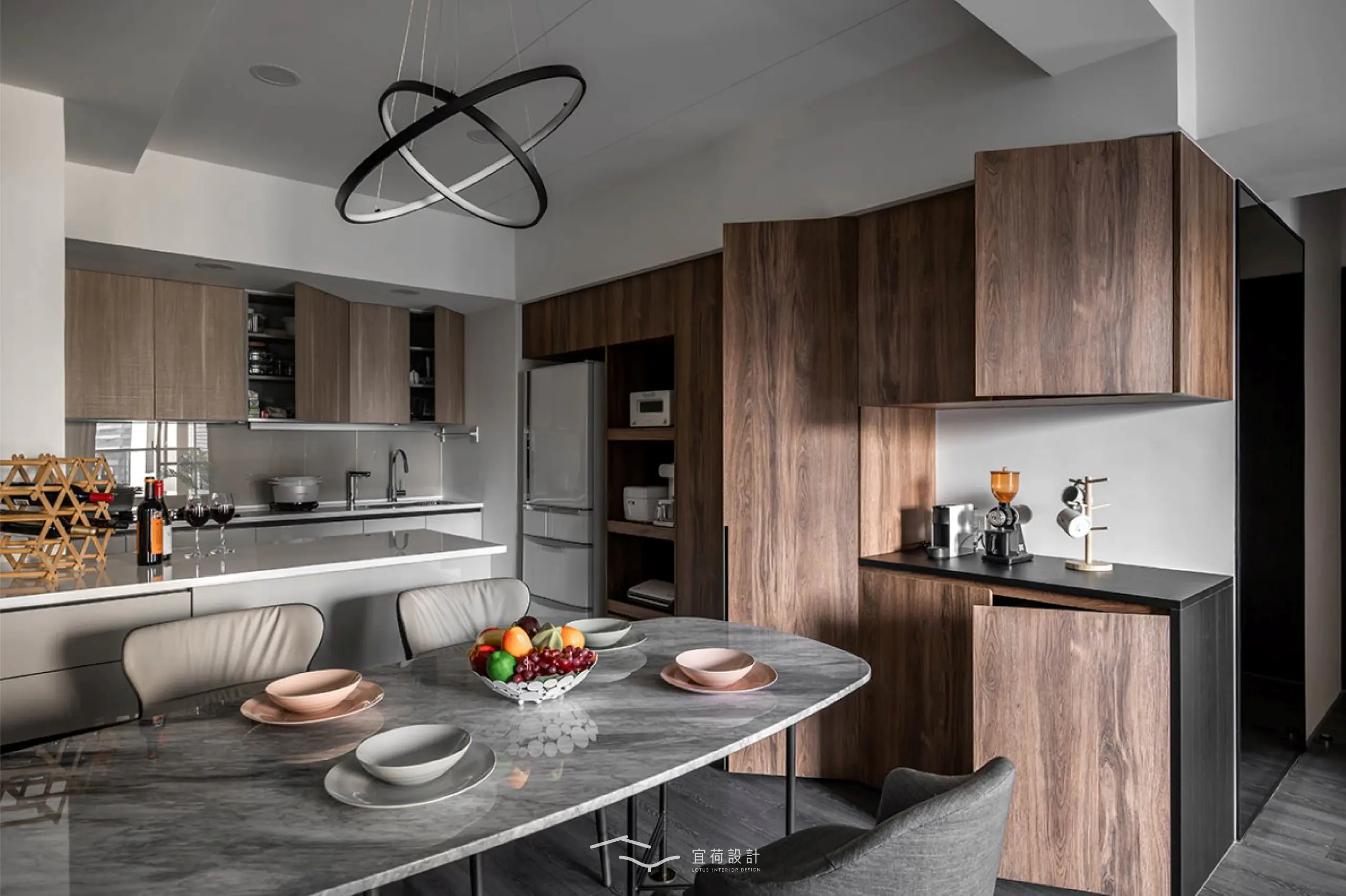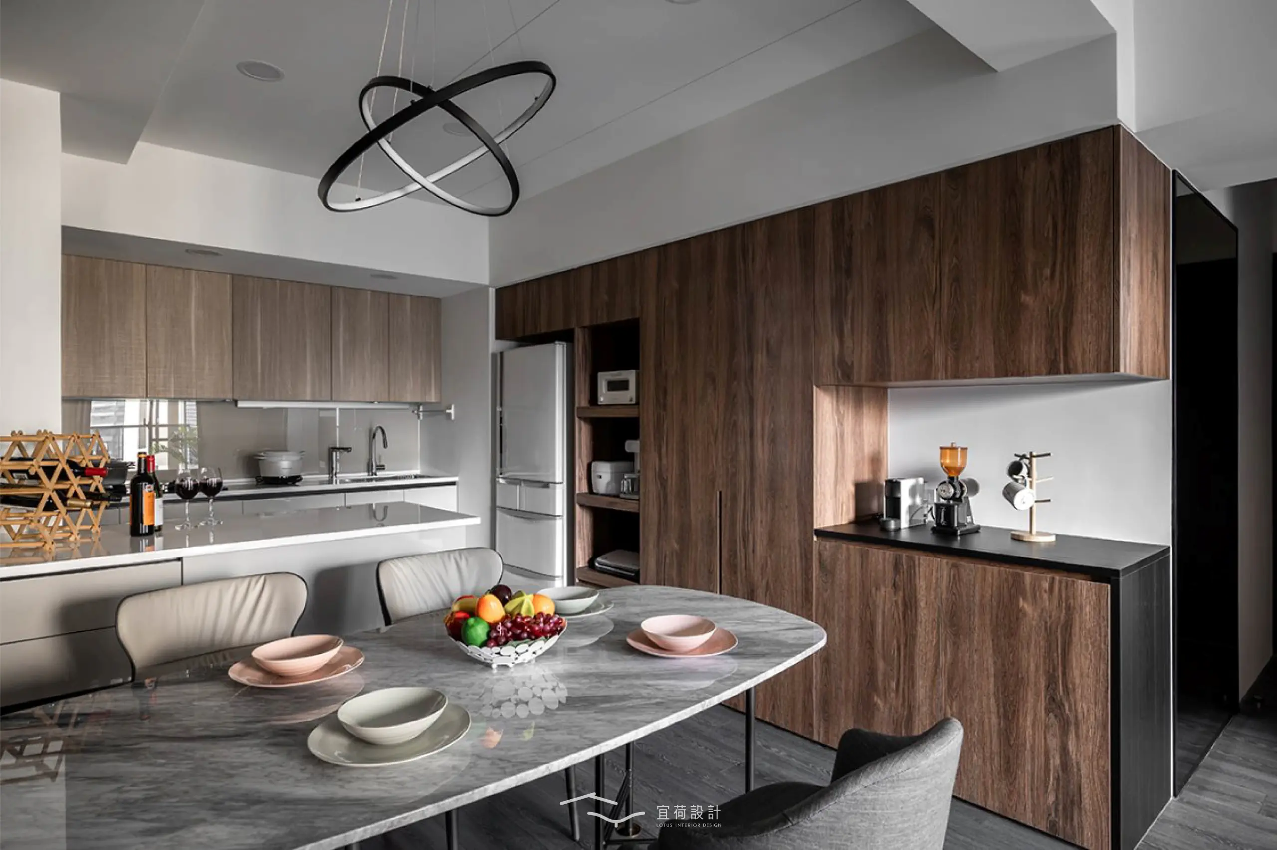 客餐廳則透過不同天花造型劃分場域,搭配造型吊燈,讓家人間的情感流動。而棘手的大樑下方則巧妙整合收納櫃、電器櫃與冰箱櫃,機能自然隱身,空間回歸純粹。