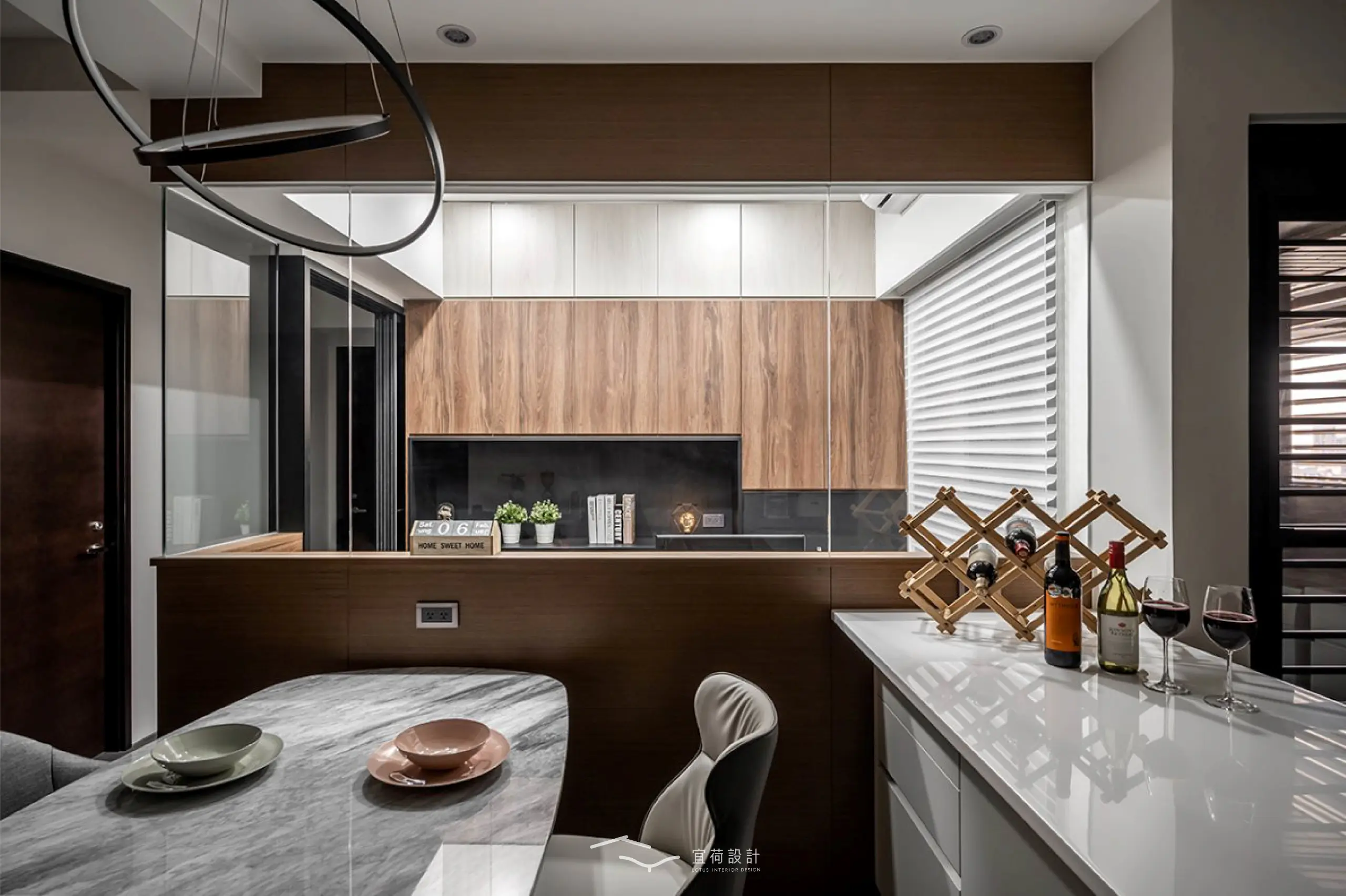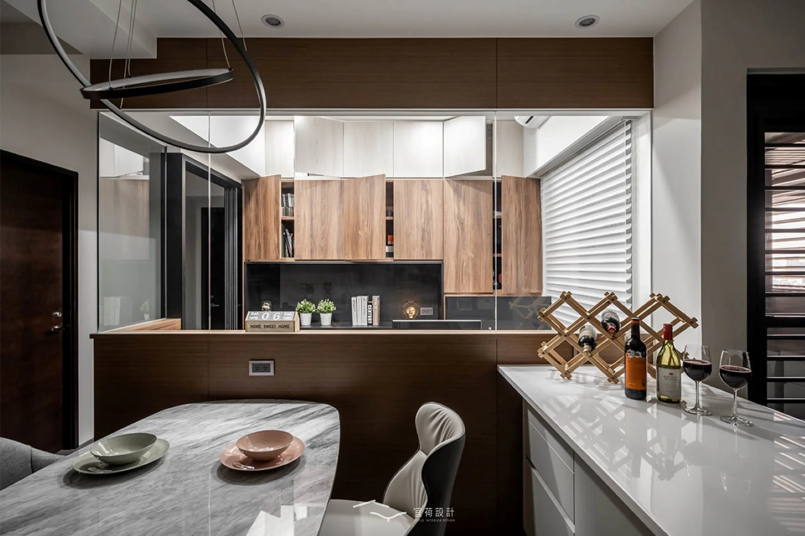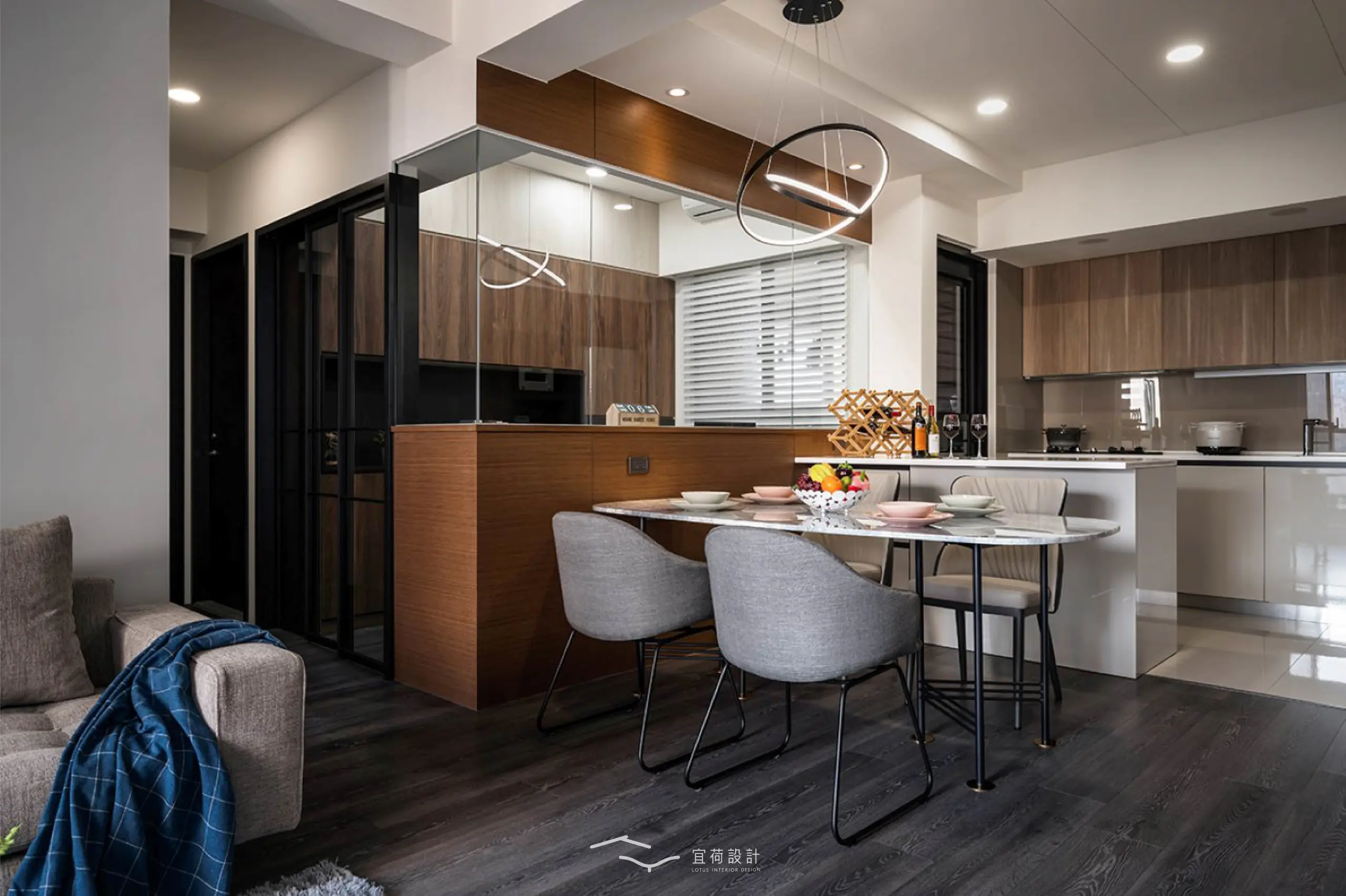 書房以上方玻璃界定,退縮配置換得更開闊的餐廚空間,即使好友滿座也依然能保持從容尺度,臥榻與櫃體亦靜靜承載生活的收藏。