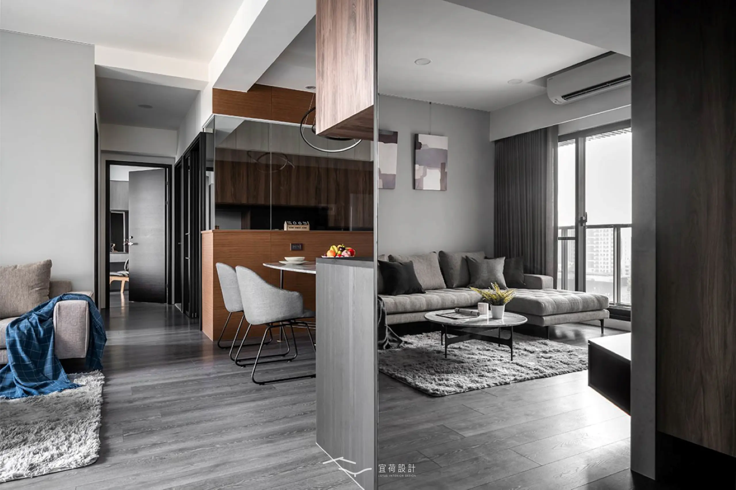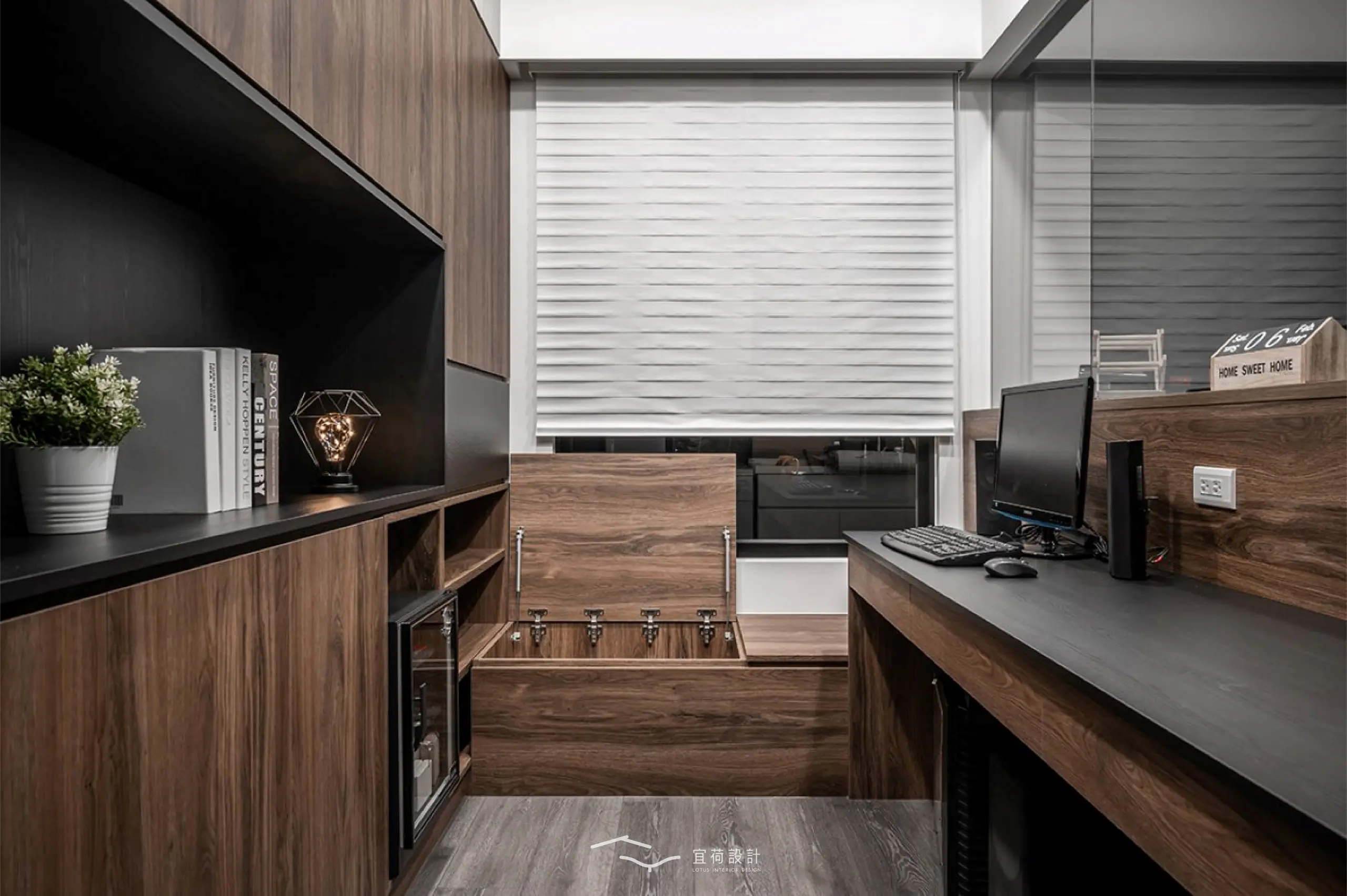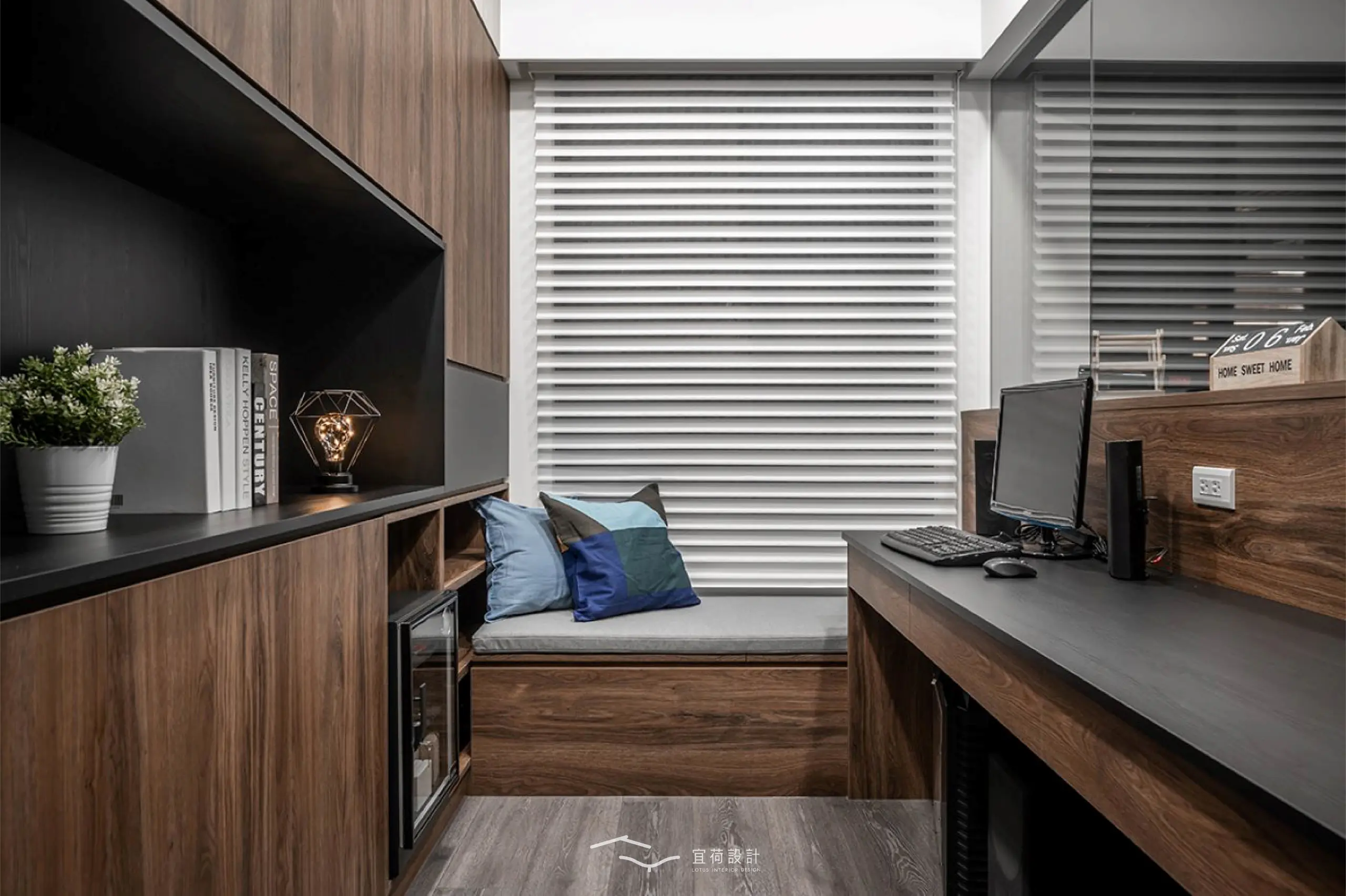 書房以上方玻璃界定,退縮配置換得更開闊的餐廚空間,即使好友滿座也依然能保持從容尺度,臥榻與櫃體亦靜靜承載生活的收藏。