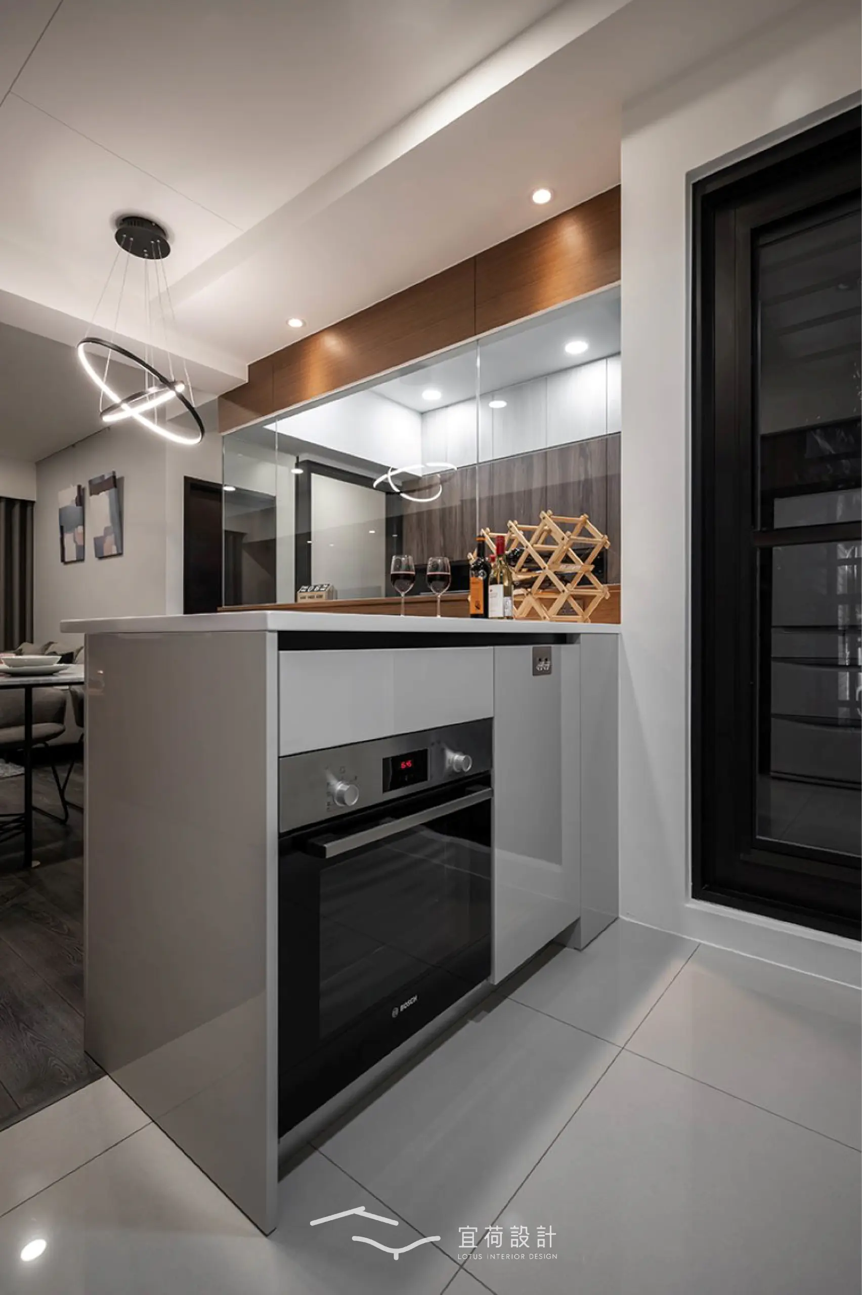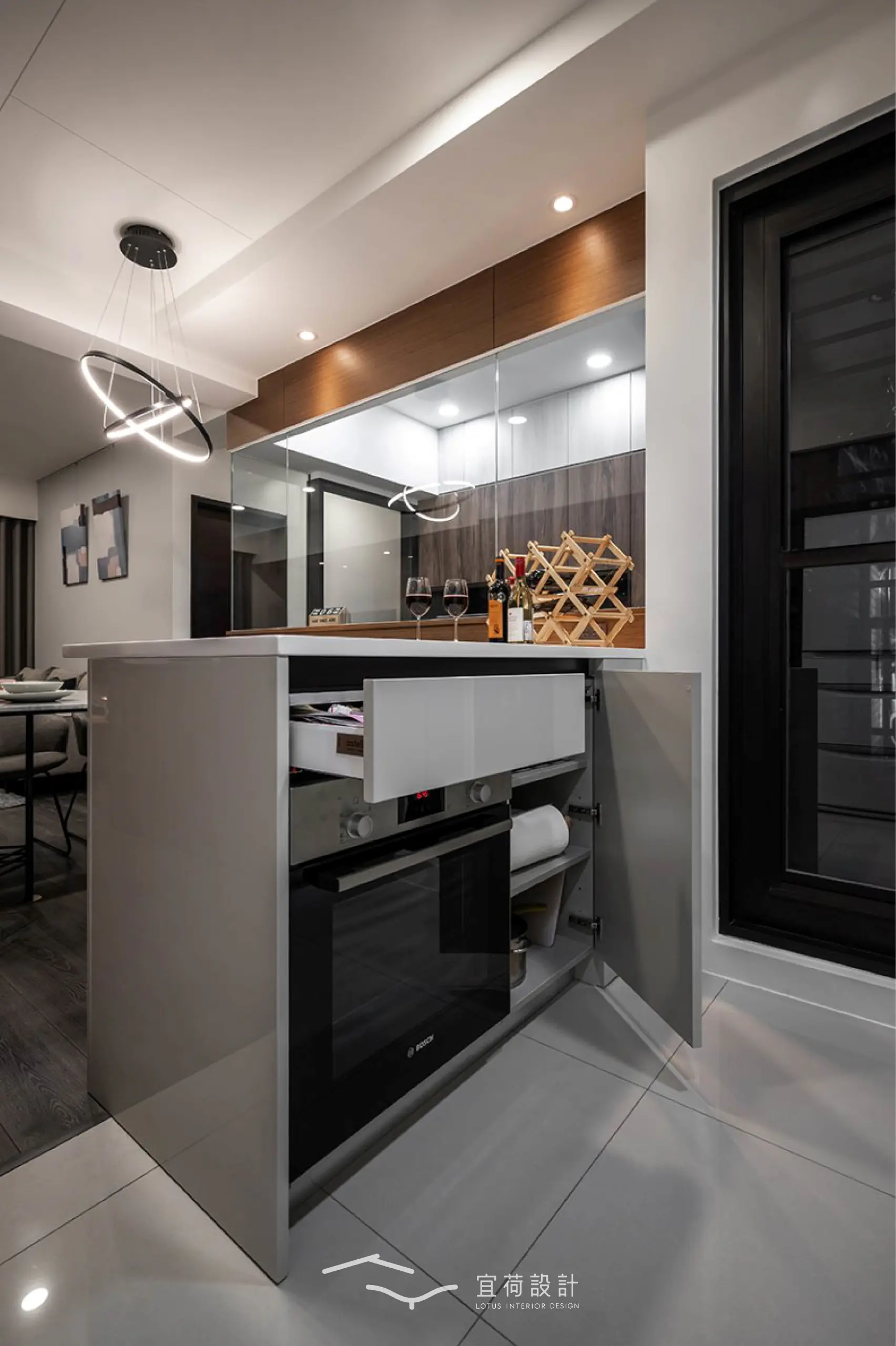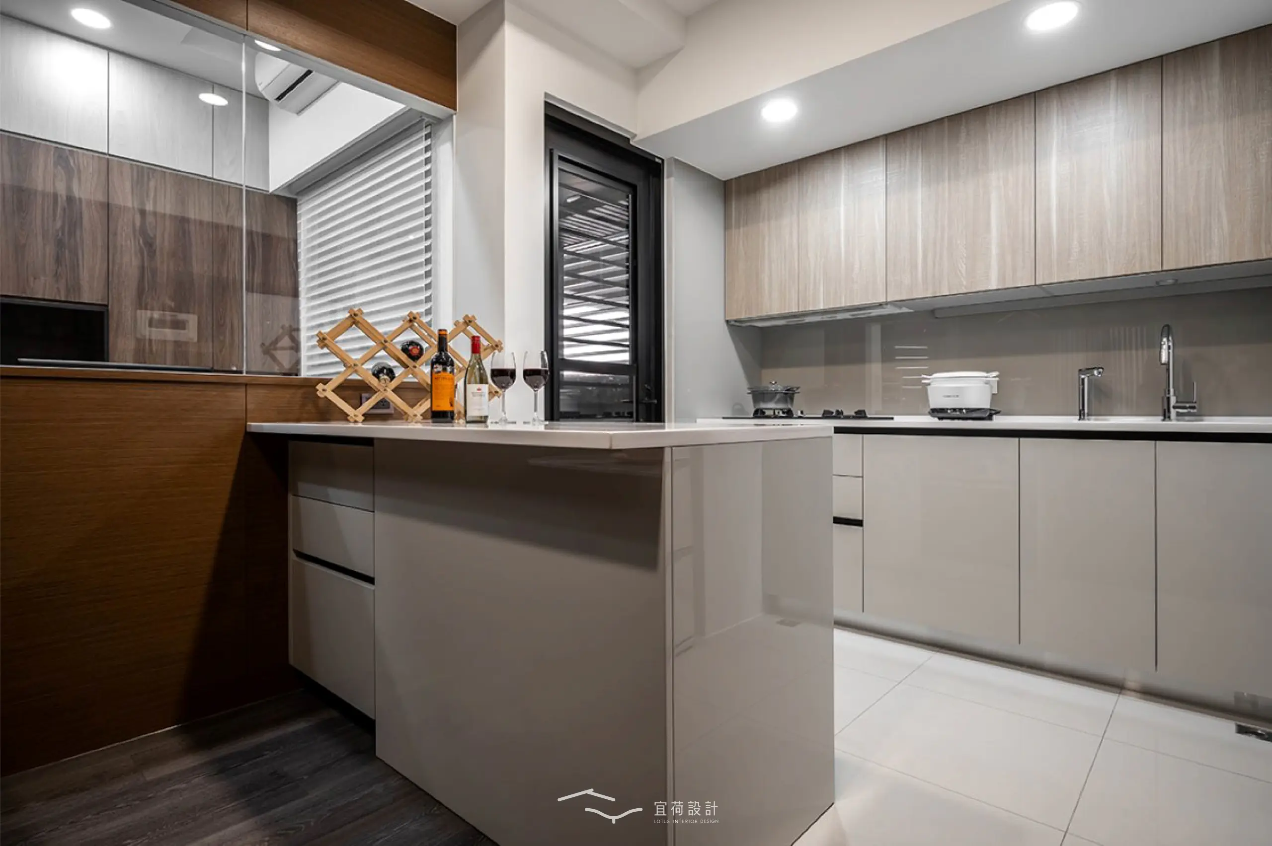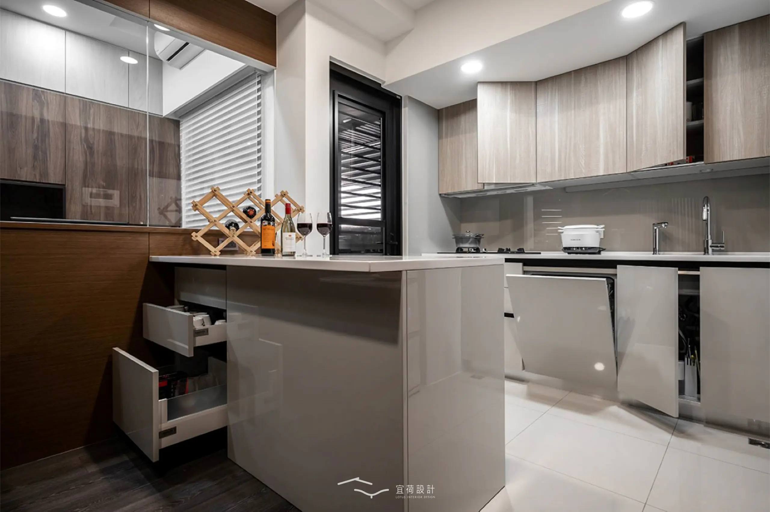 因屋主的喜好,廚房特別增設中島,延伸料理檯面,也將烤箱與收納一併納入,讓下廚成為一種享受。