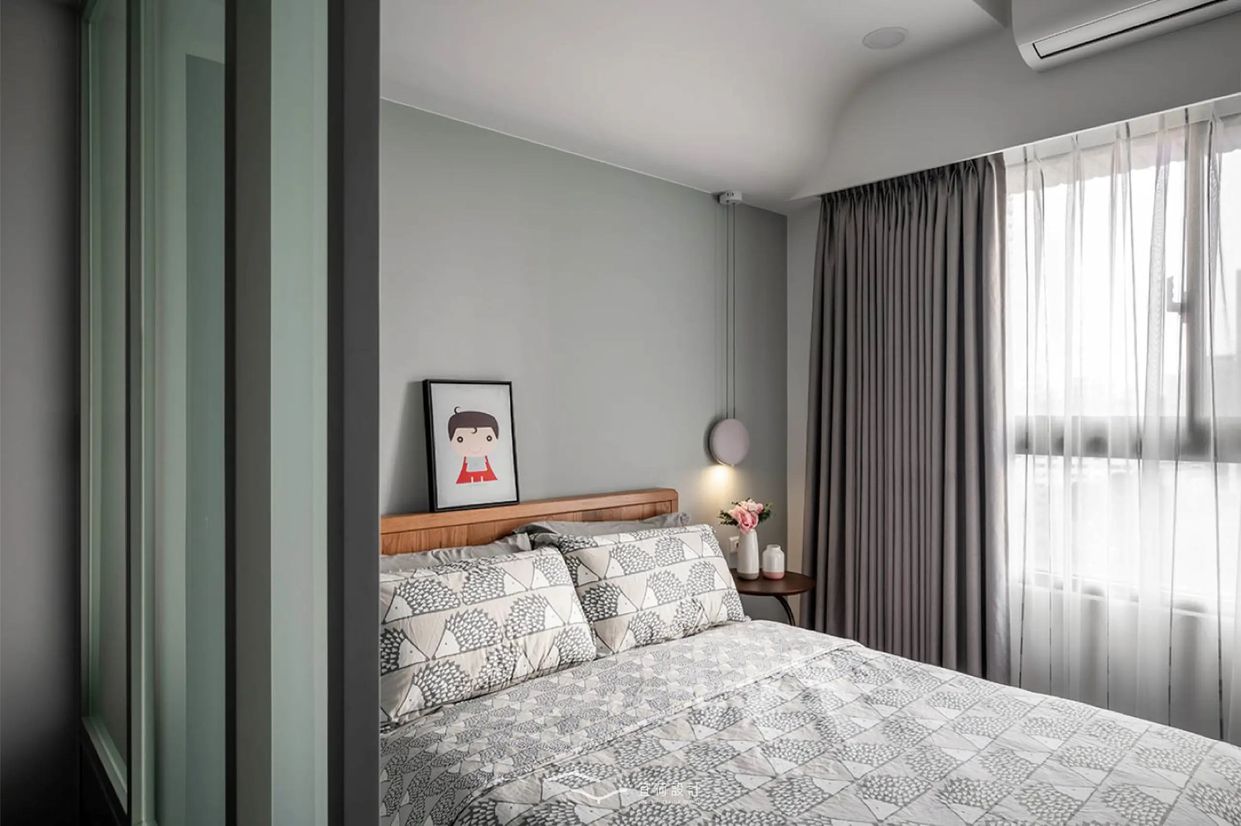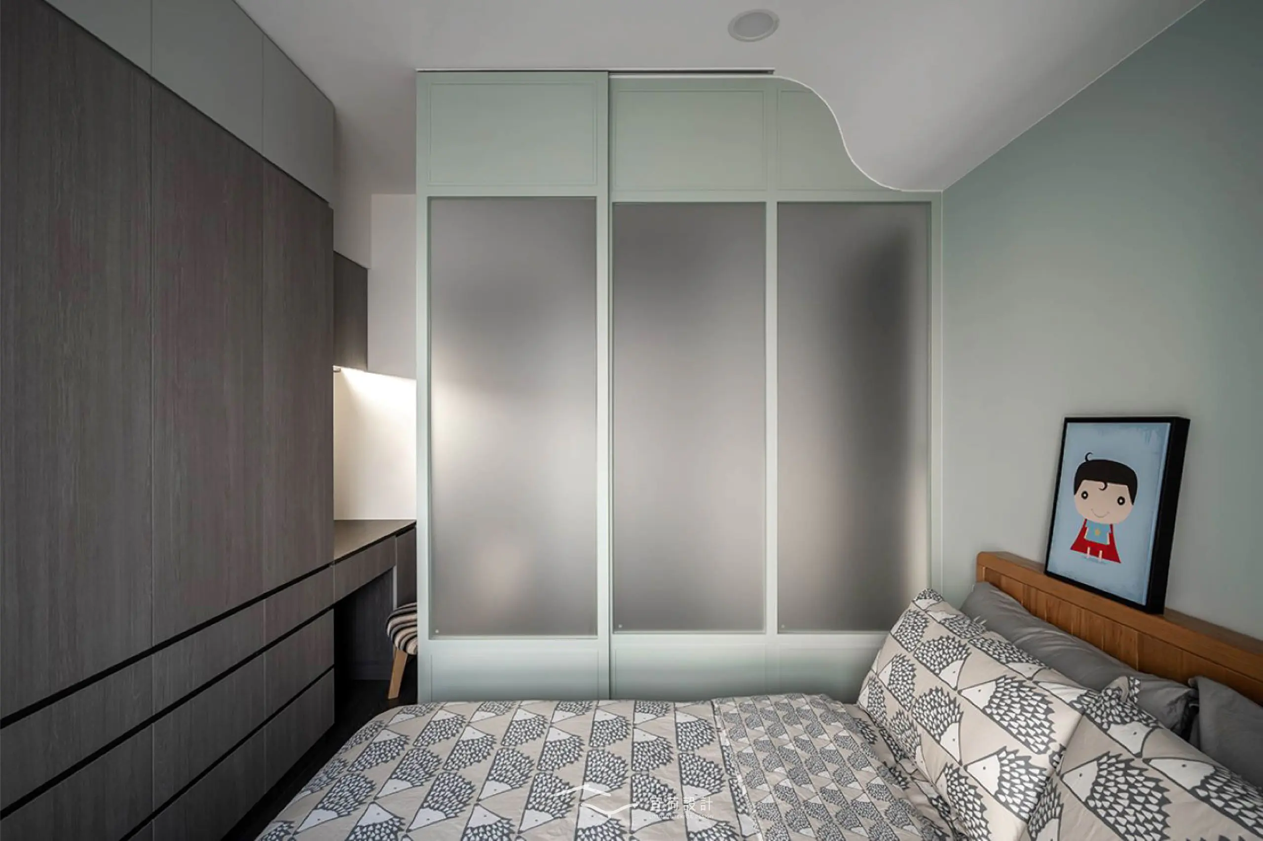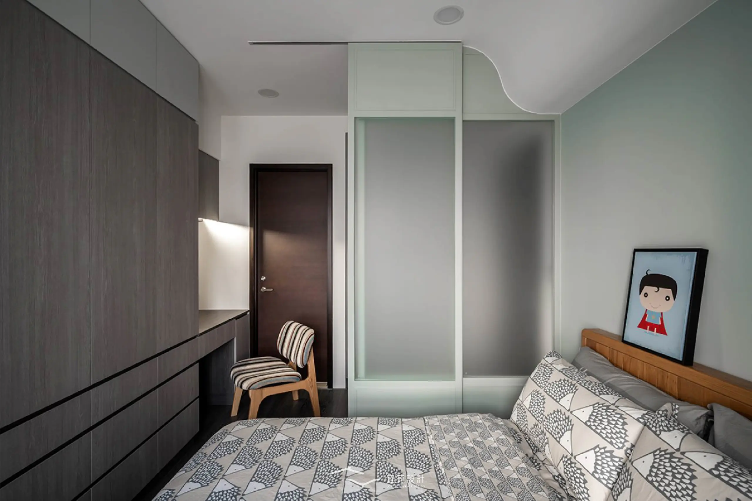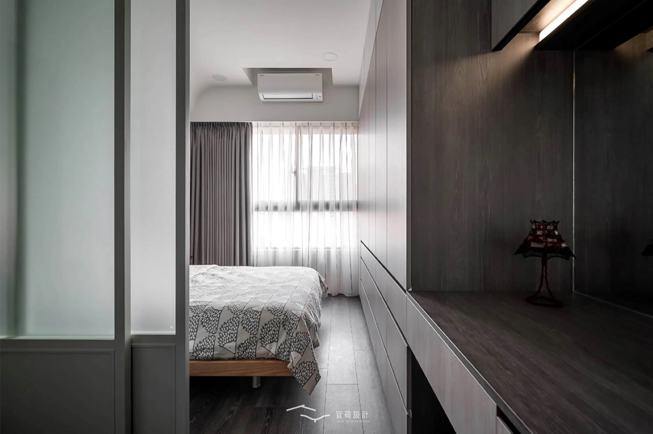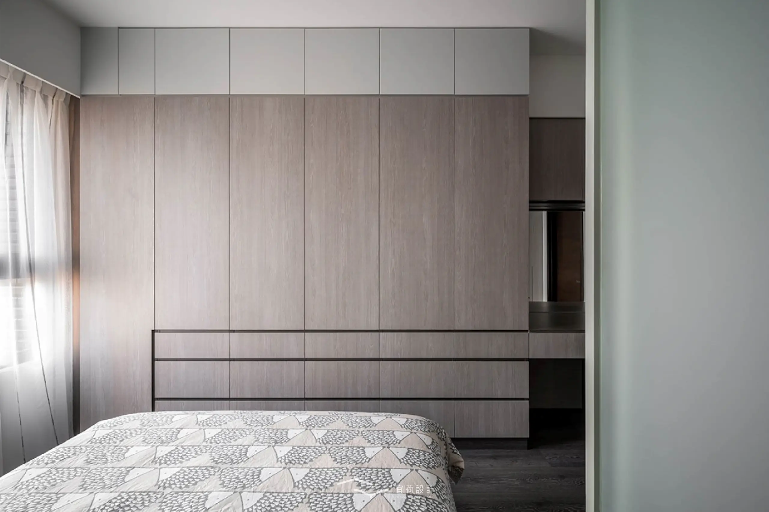 主臥以玻璃拉門屏風柔化浴室門對床的顧慮,並用圓弧天花修飾樑線,讓休息更安心寧靜,一整面衣櫃與梳化空間,實現女主人心中的理想日常。