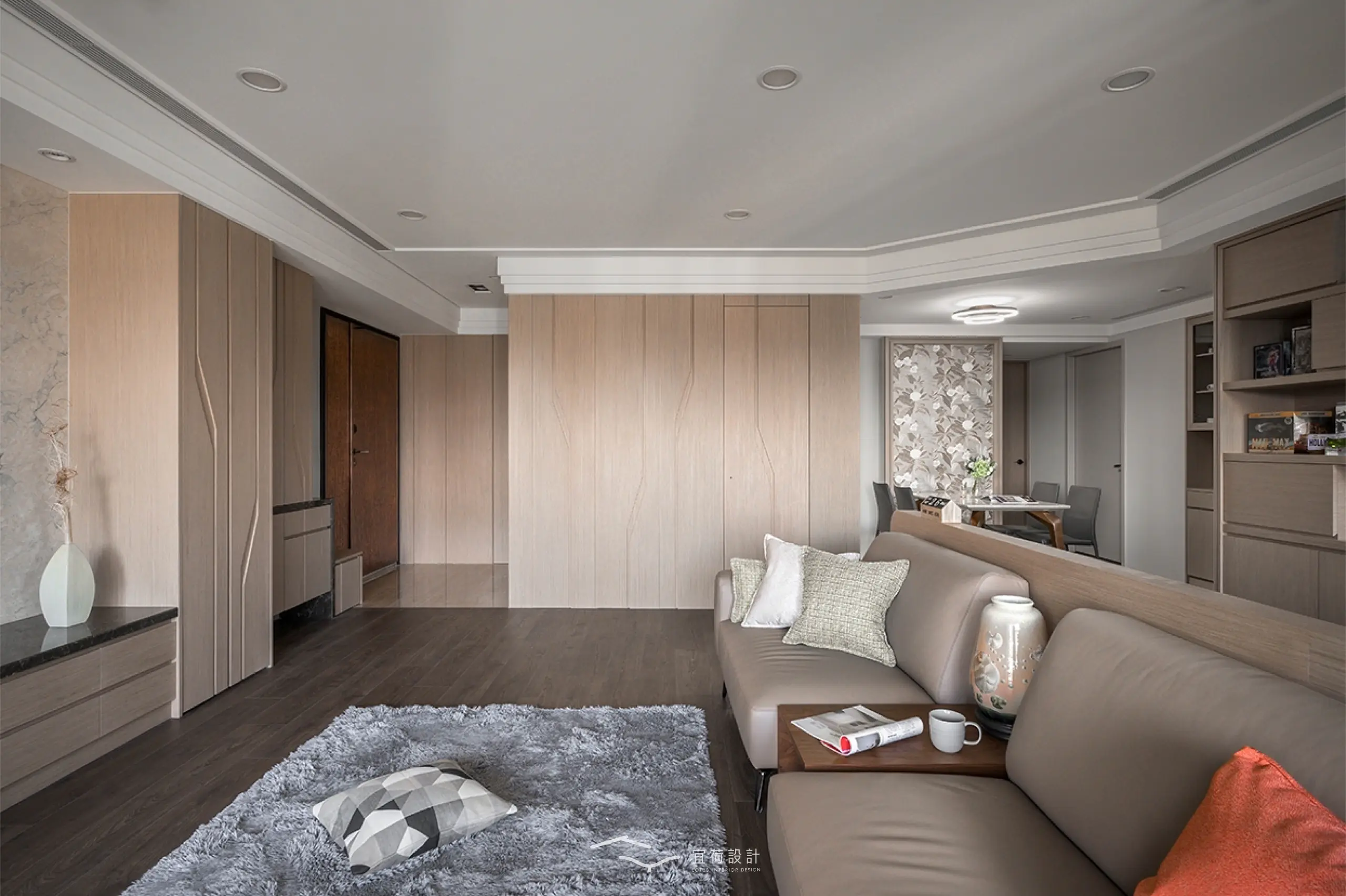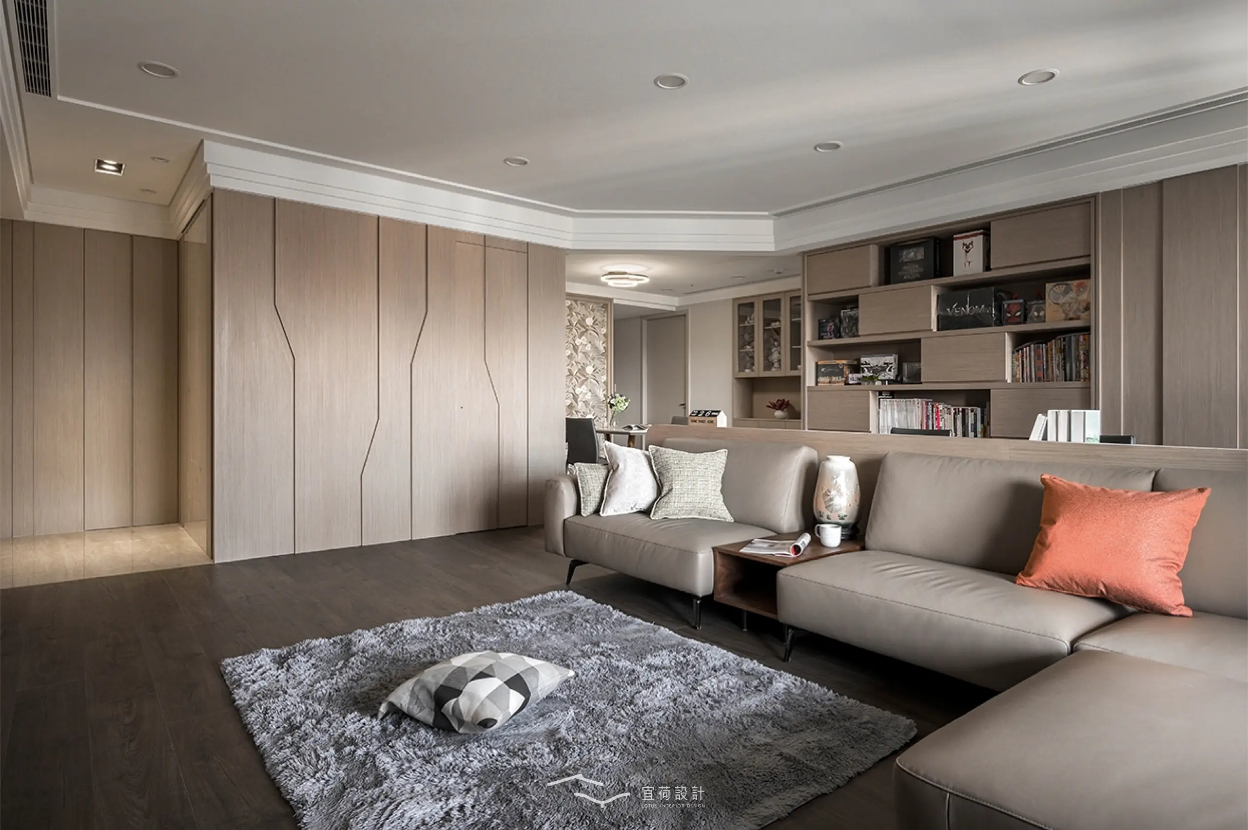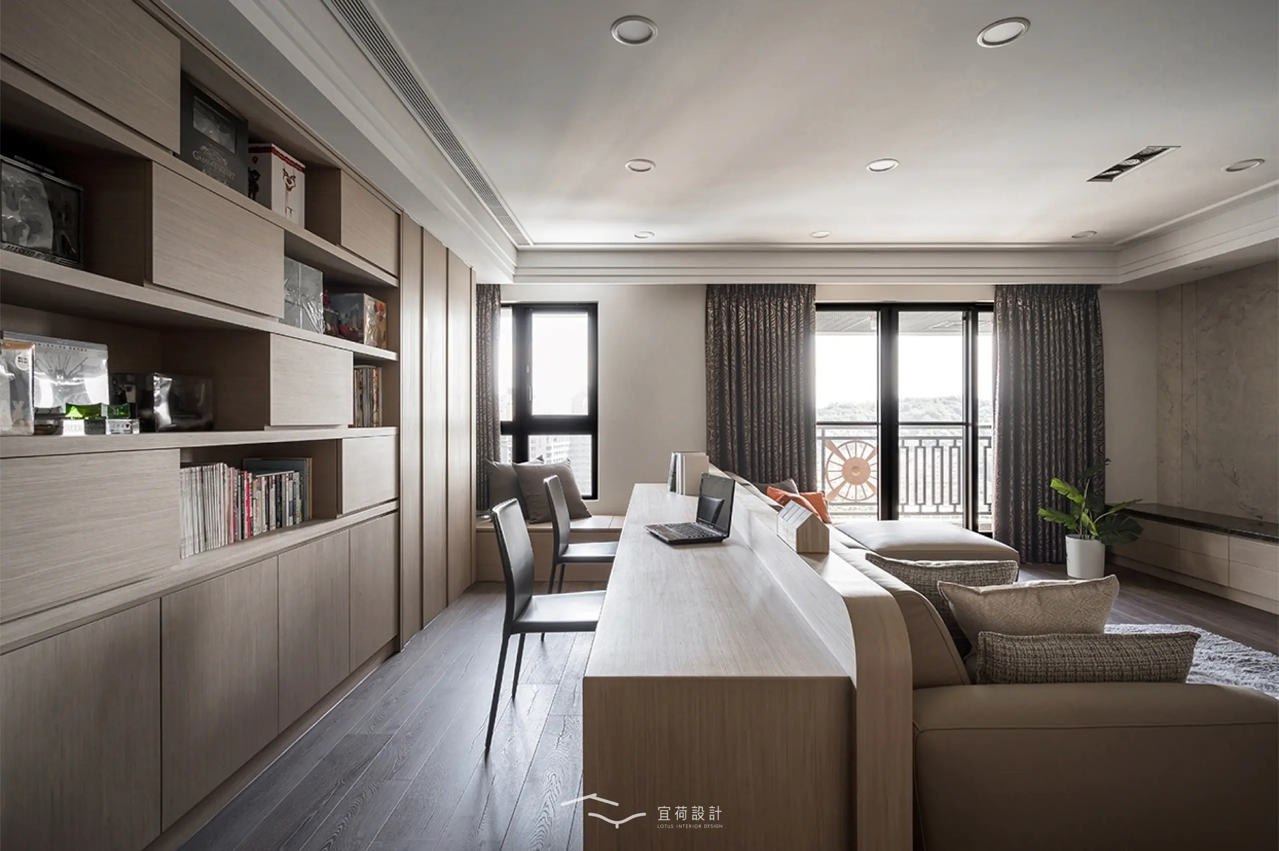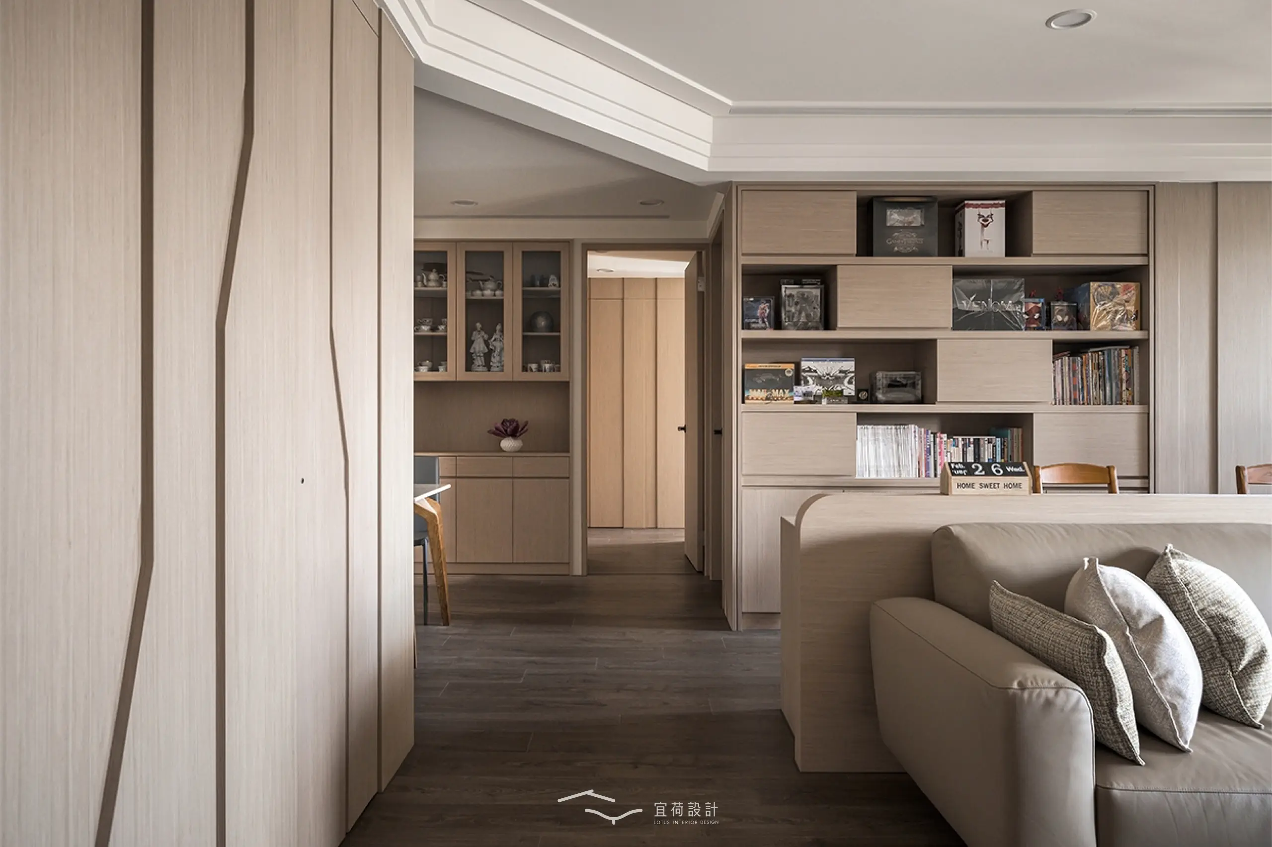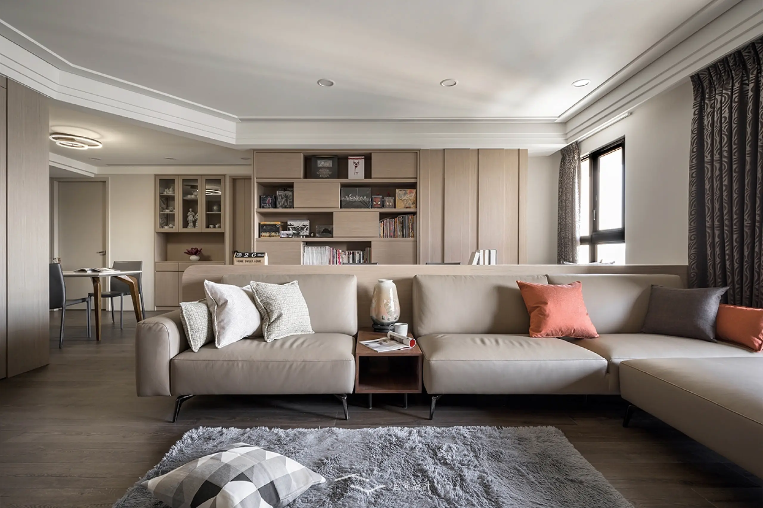 全室規劃為四房兩廳兩衛,並針對家中成員的閱讀習慣與書籍收藏需求,將書房融入公共區域。整體風格以木質調為基底,佐以俐落線條與細緻紋理。整面書牆開展出家的文化氣息,並使用高互動性的長桌,串聯起全家人的日常互動。考量到年幼孩童的活動安全,設計師以圓弧修邊取代銳角,讓空間線條柔化,也讓生活更顯安心。