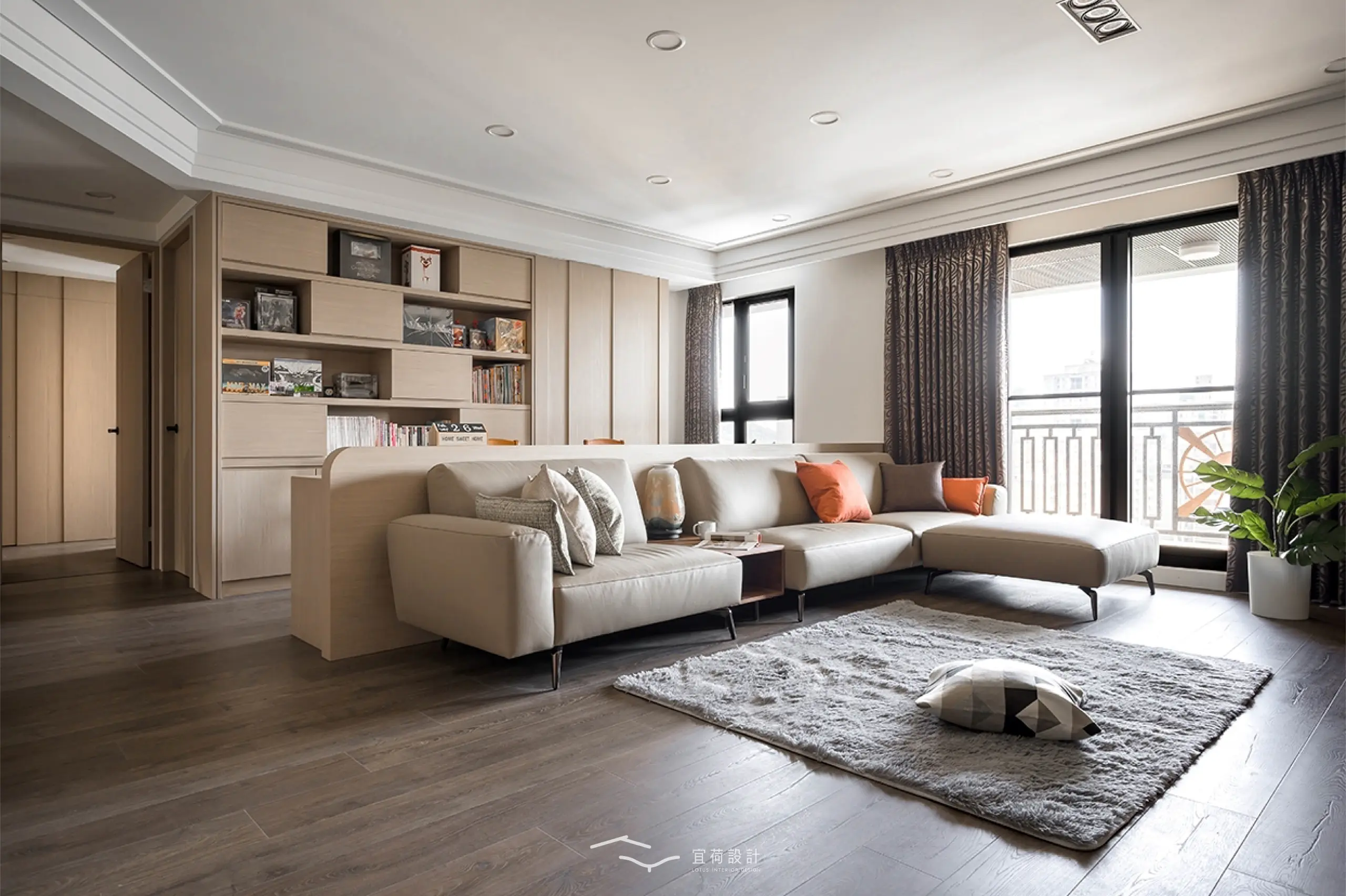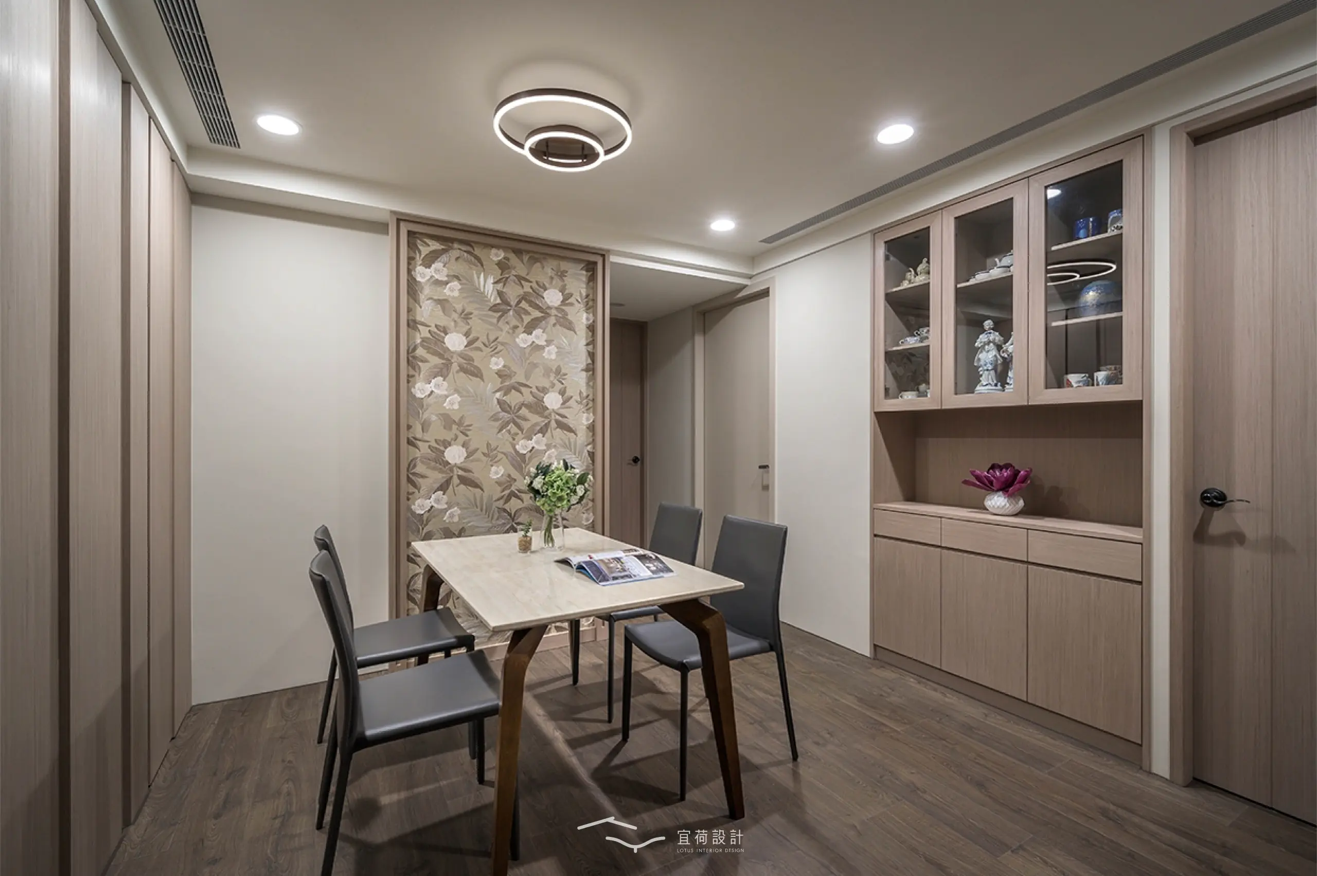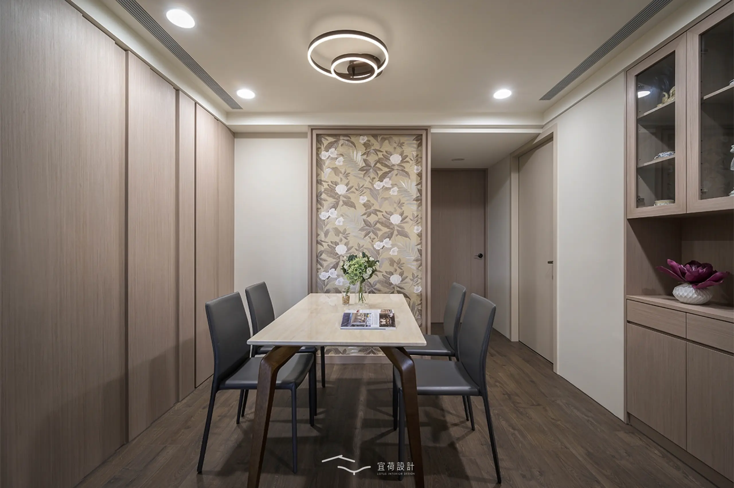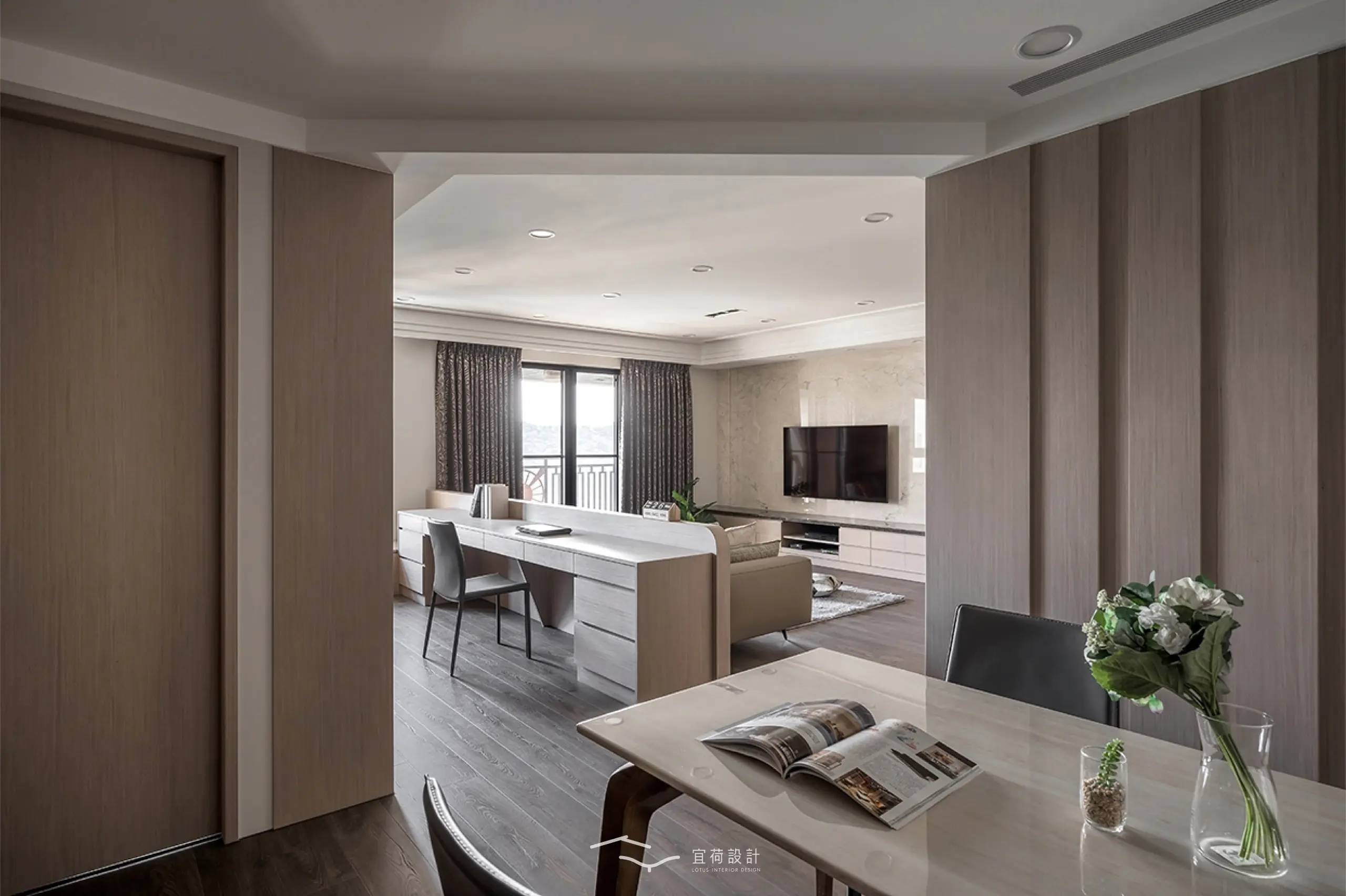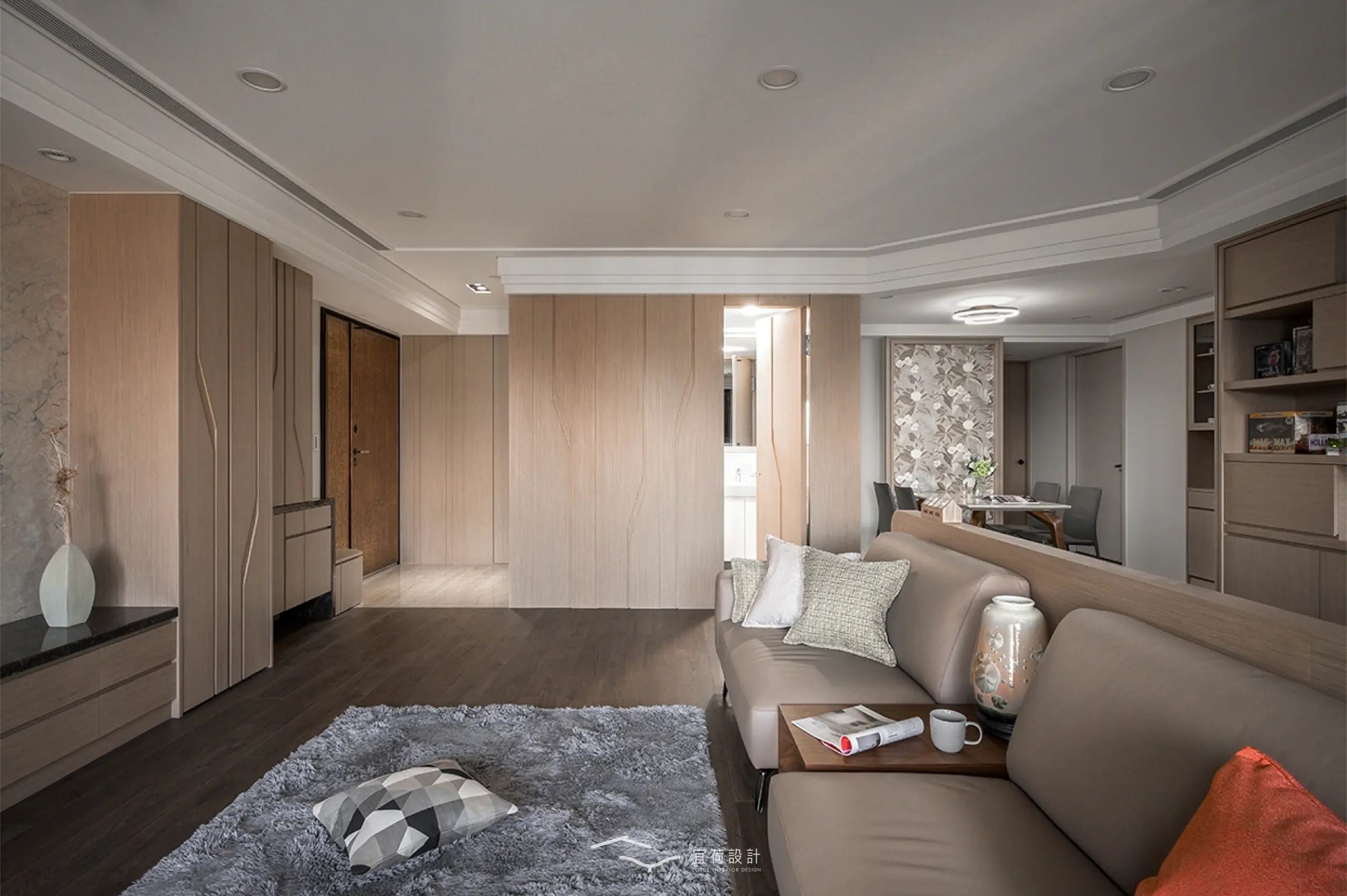 全室規劃為四房兩廳兩衛,並針對家中成員的閱讀習慣與書籍收藏需求,將書房融入公共區域。整體風格以木質調為基底,佐以俐落線條與細緻紋理。整面書牆開展出家的文化氣息,並使用高互動性的長桌,串聯起全家人的日常互動。考量到年幼孩童的活動安全,設計師以圓弧修邊取代銳角,讓空間線條柔化,也讓生活更顯安心。