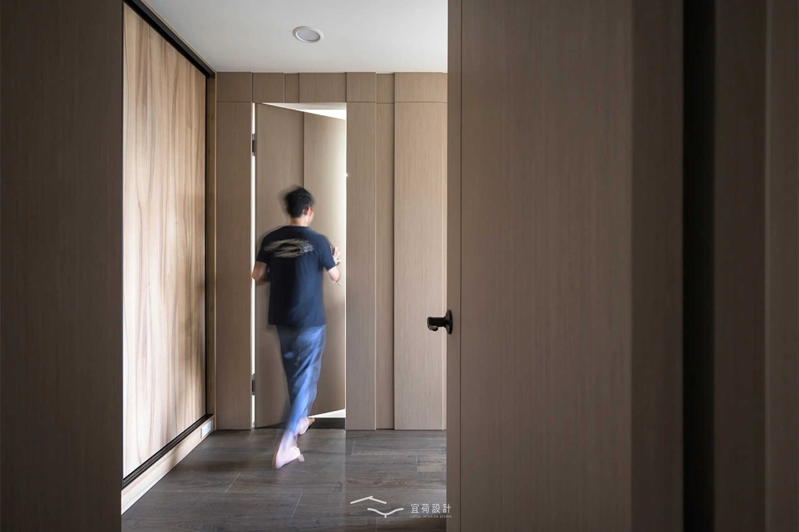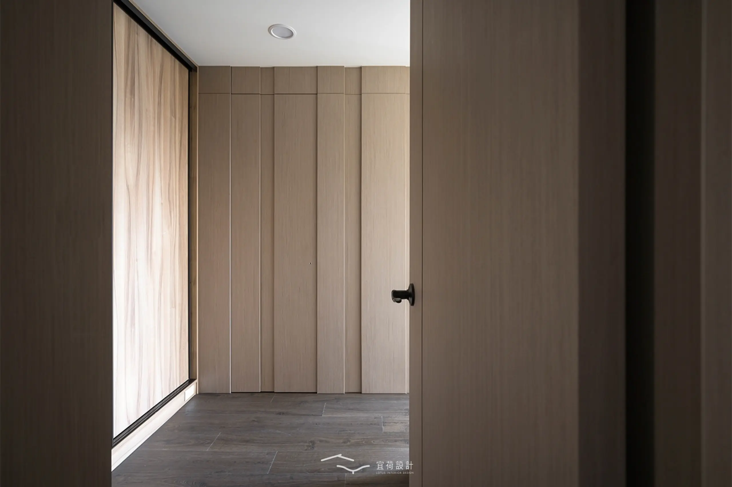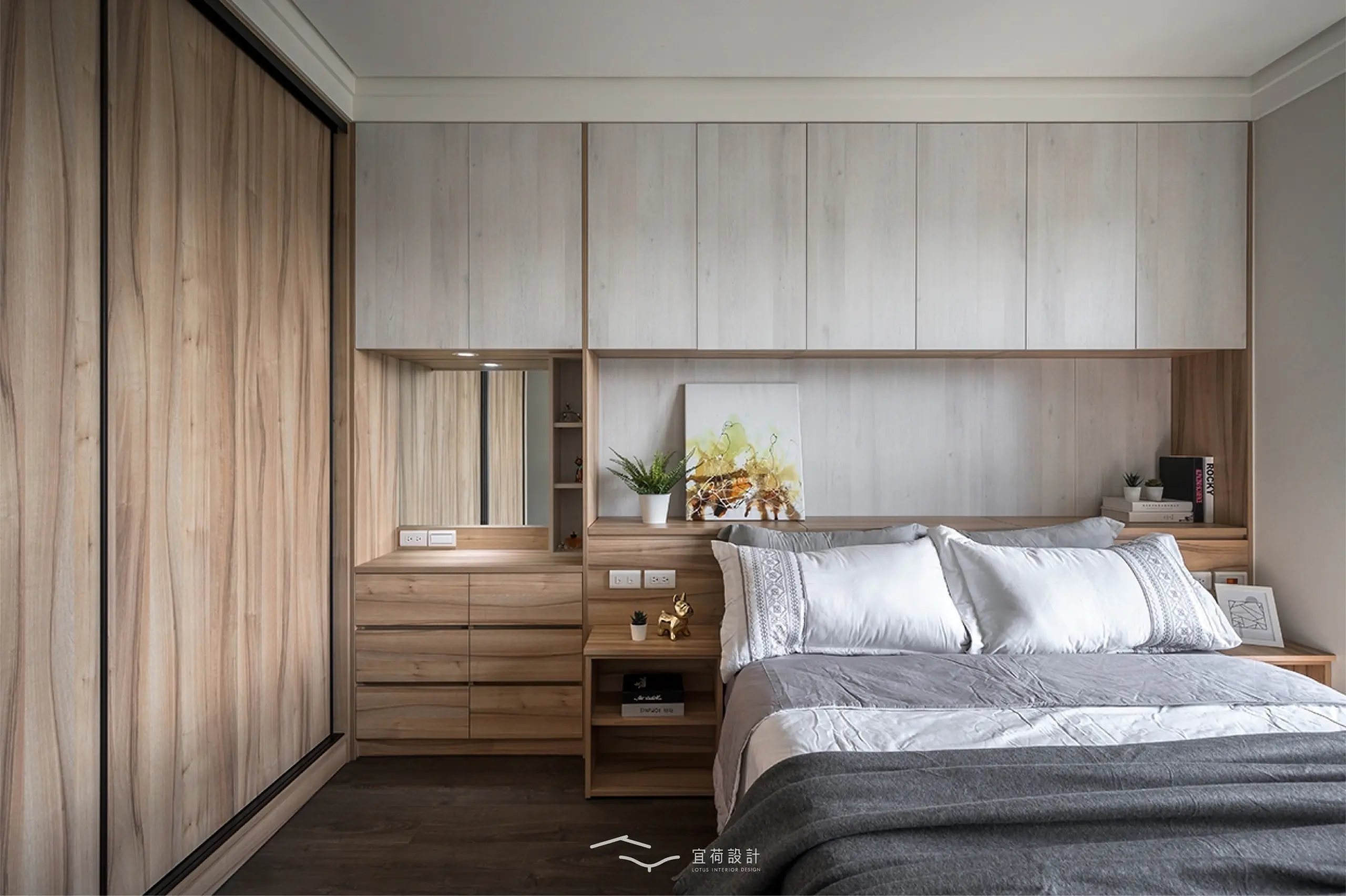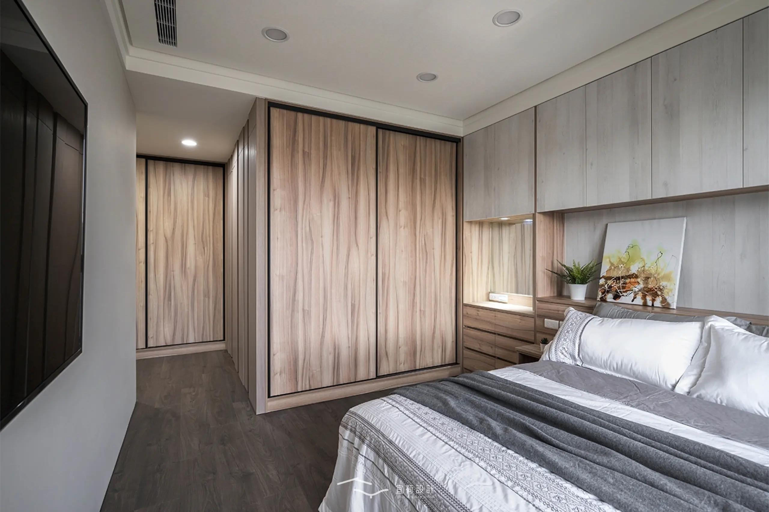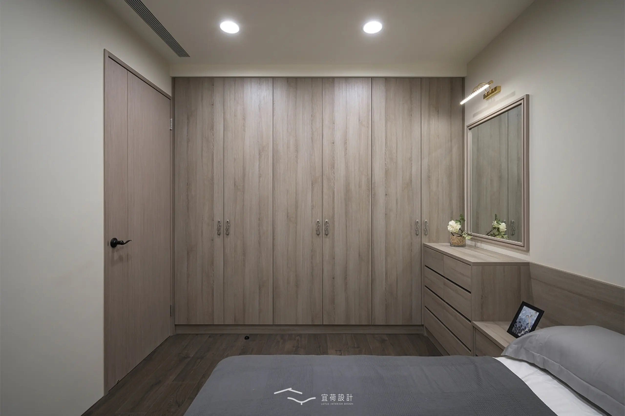 臥室區延續溫潤氛圍,根據不同使用者的生活節奏,安排充足收納與柔和光線,讓休憩成為一種日常的療癒。浴室門則採隱藏式設計,兼顧美學與風水考量。