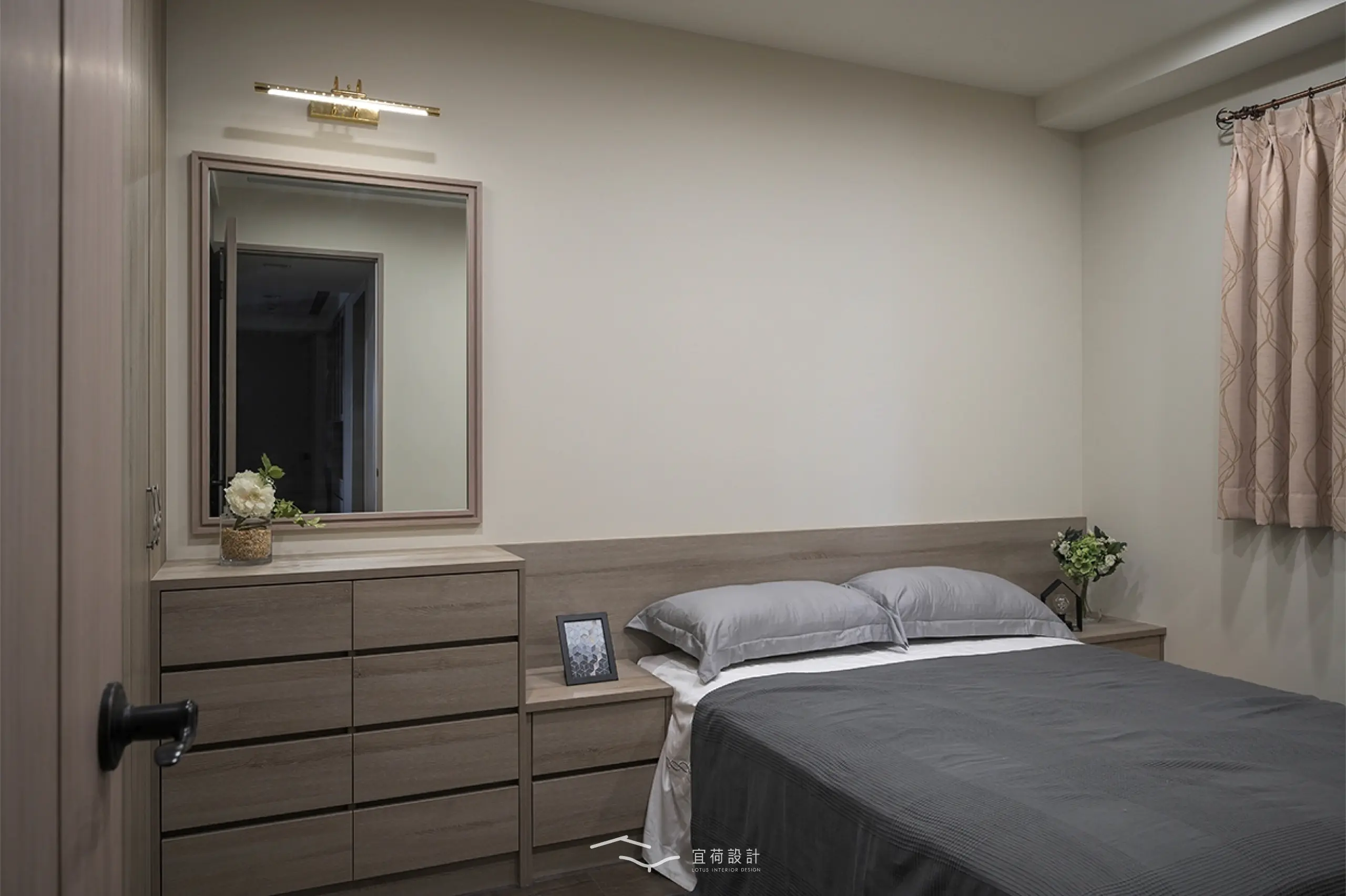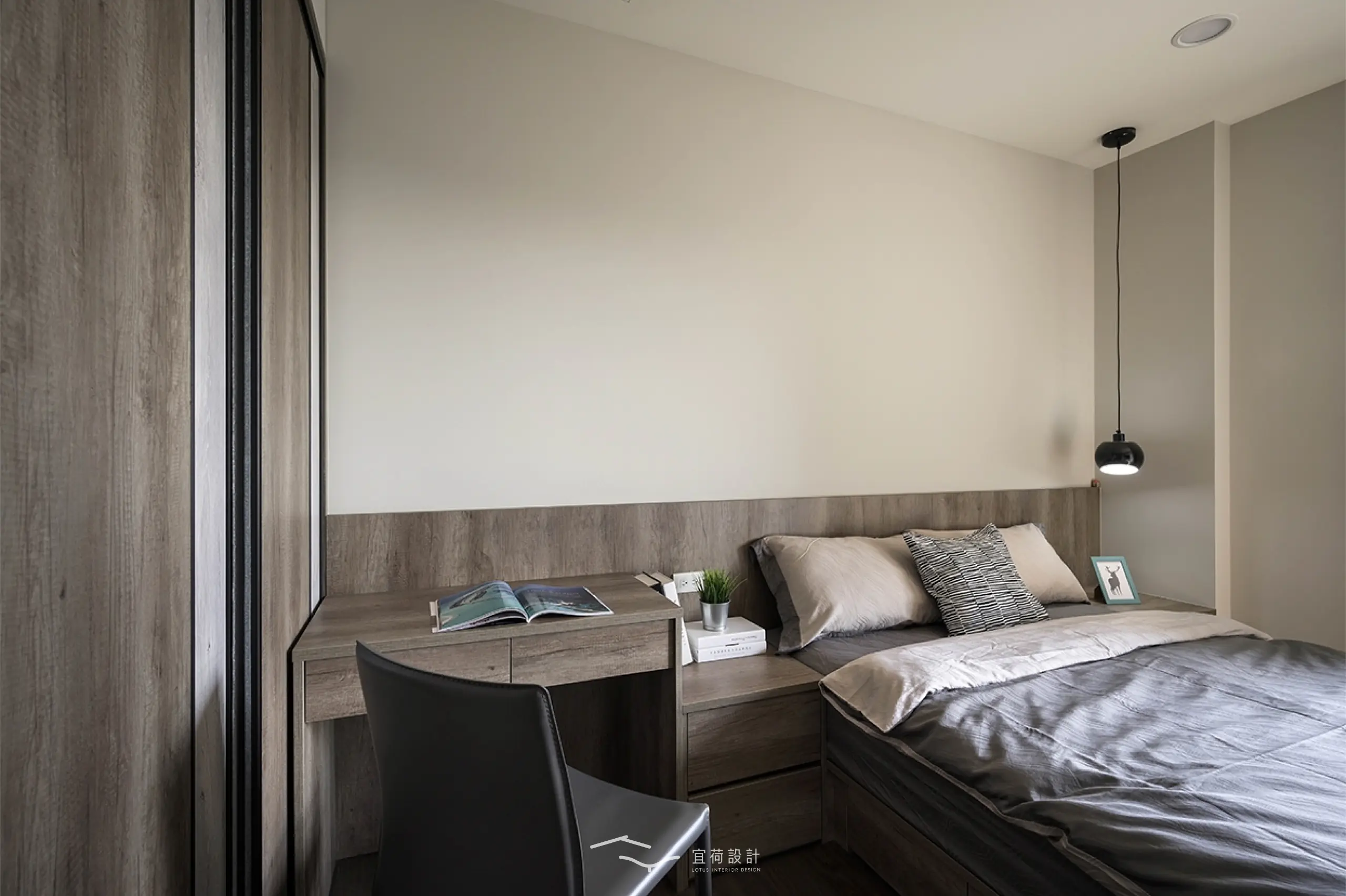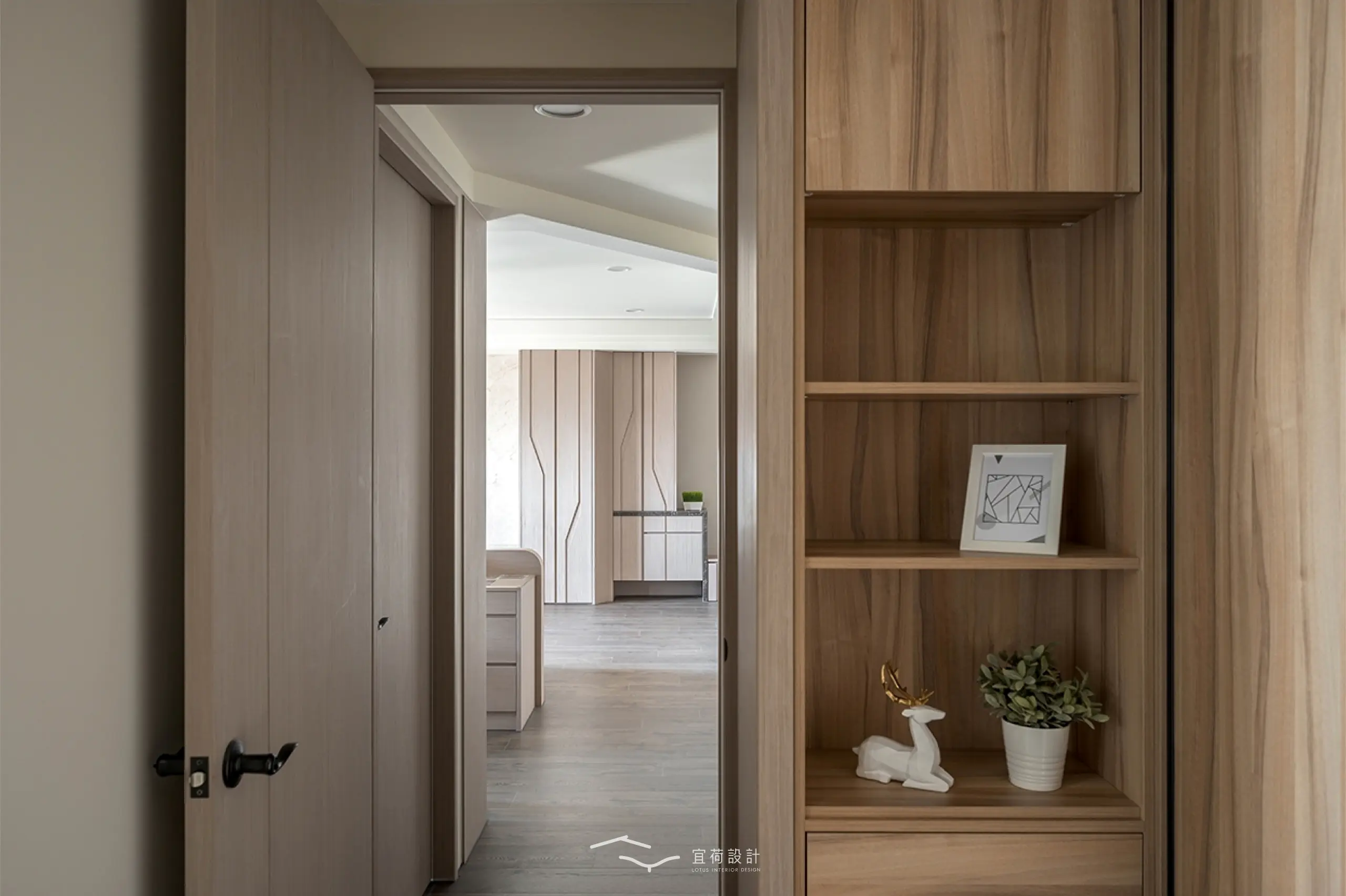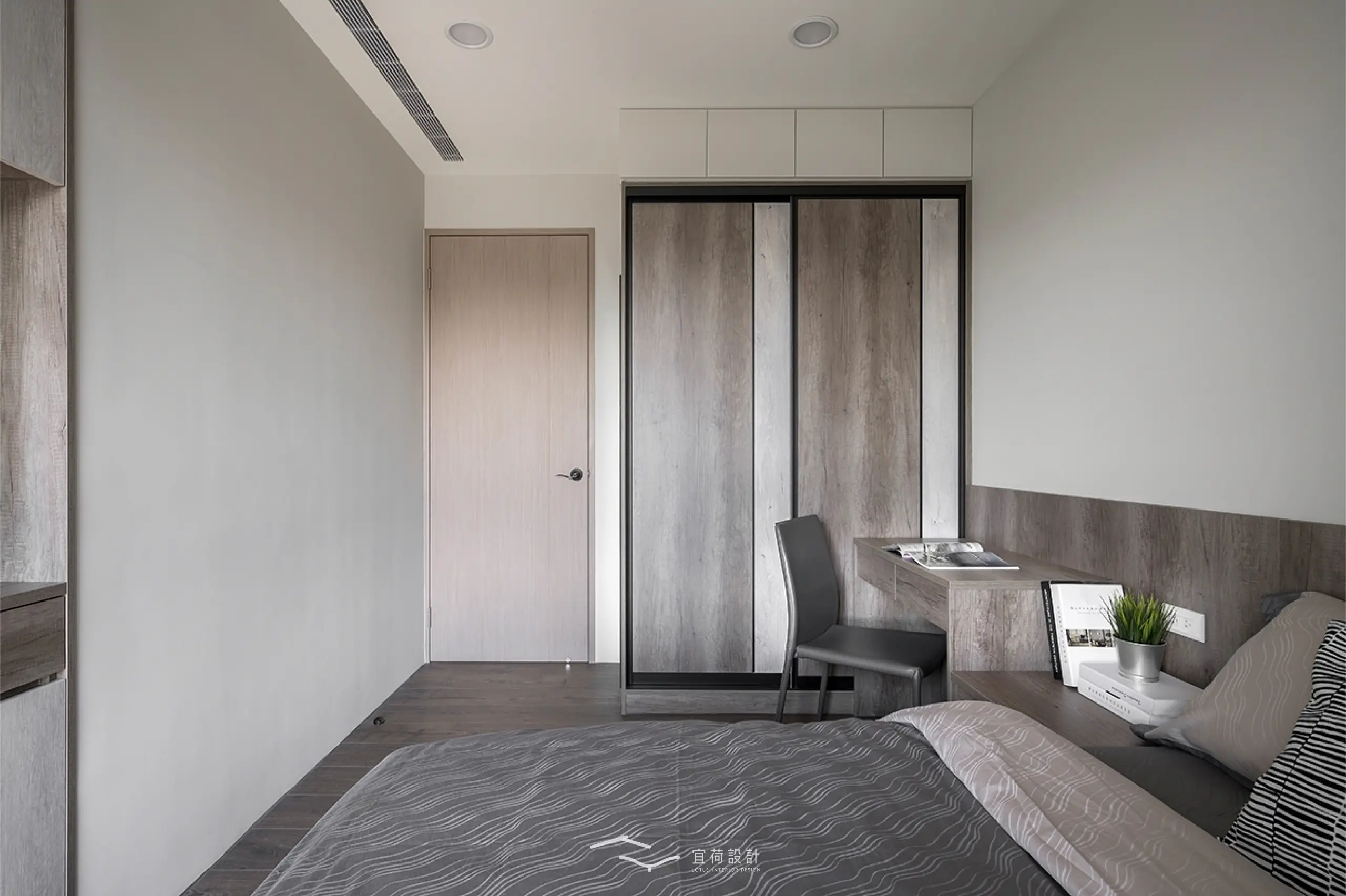 臥室區延續溫潤氛圍,根據不同使用者的生活節奏,安排充足收納與柔和光線,讓休憩成為一種日常的療癒。浴室門則採隱藏式設計,兼顧美學與風水考量。