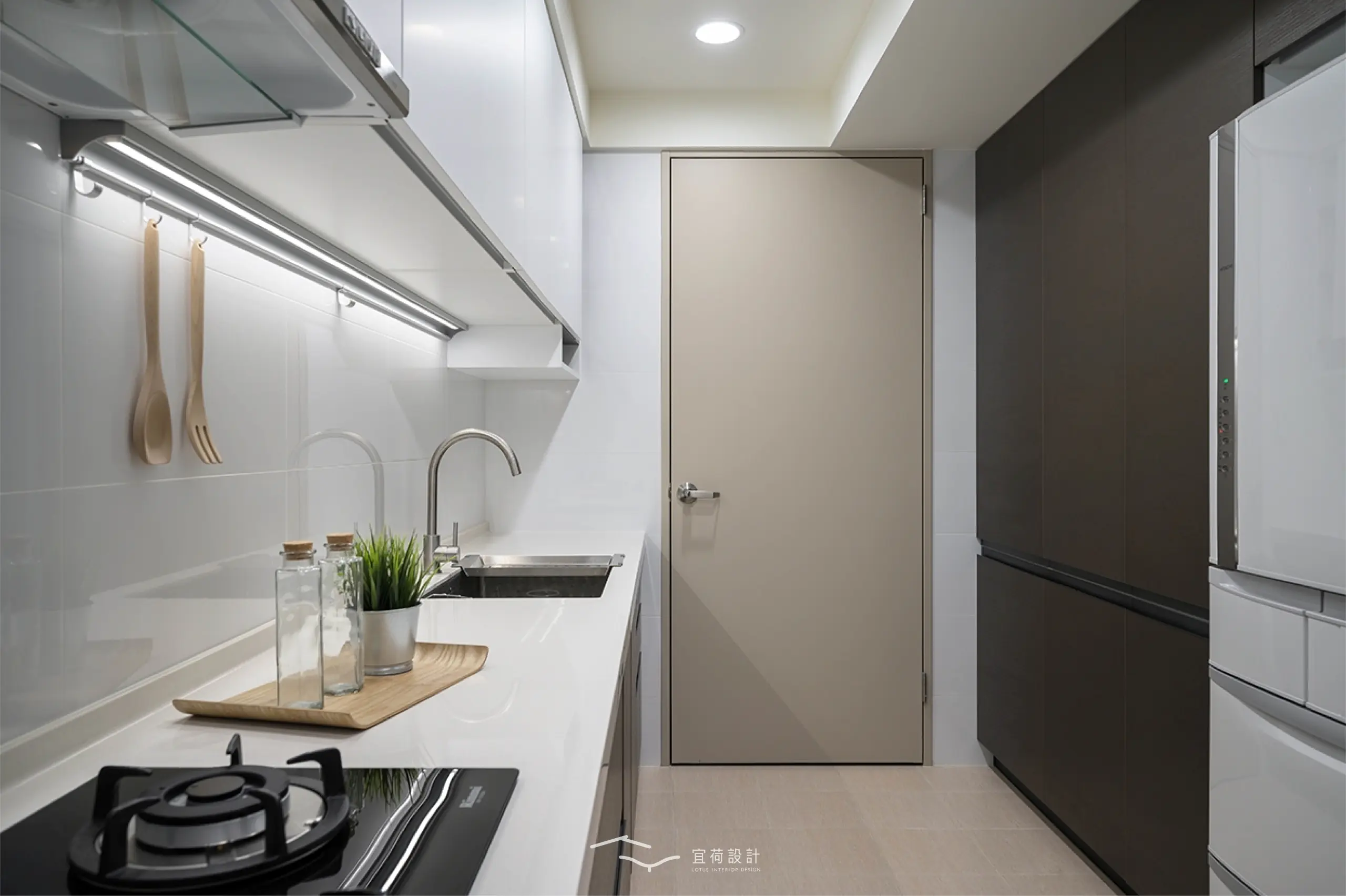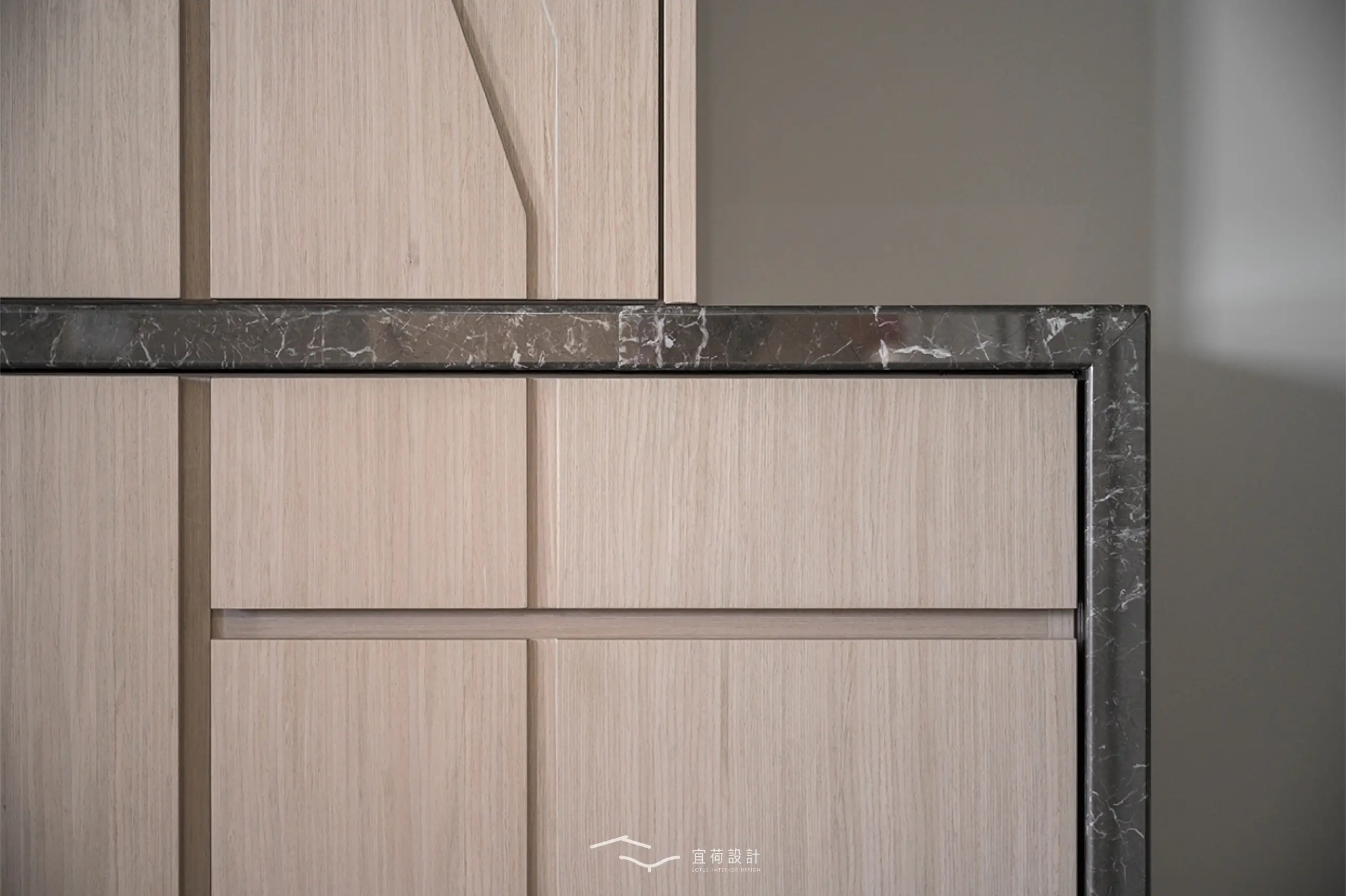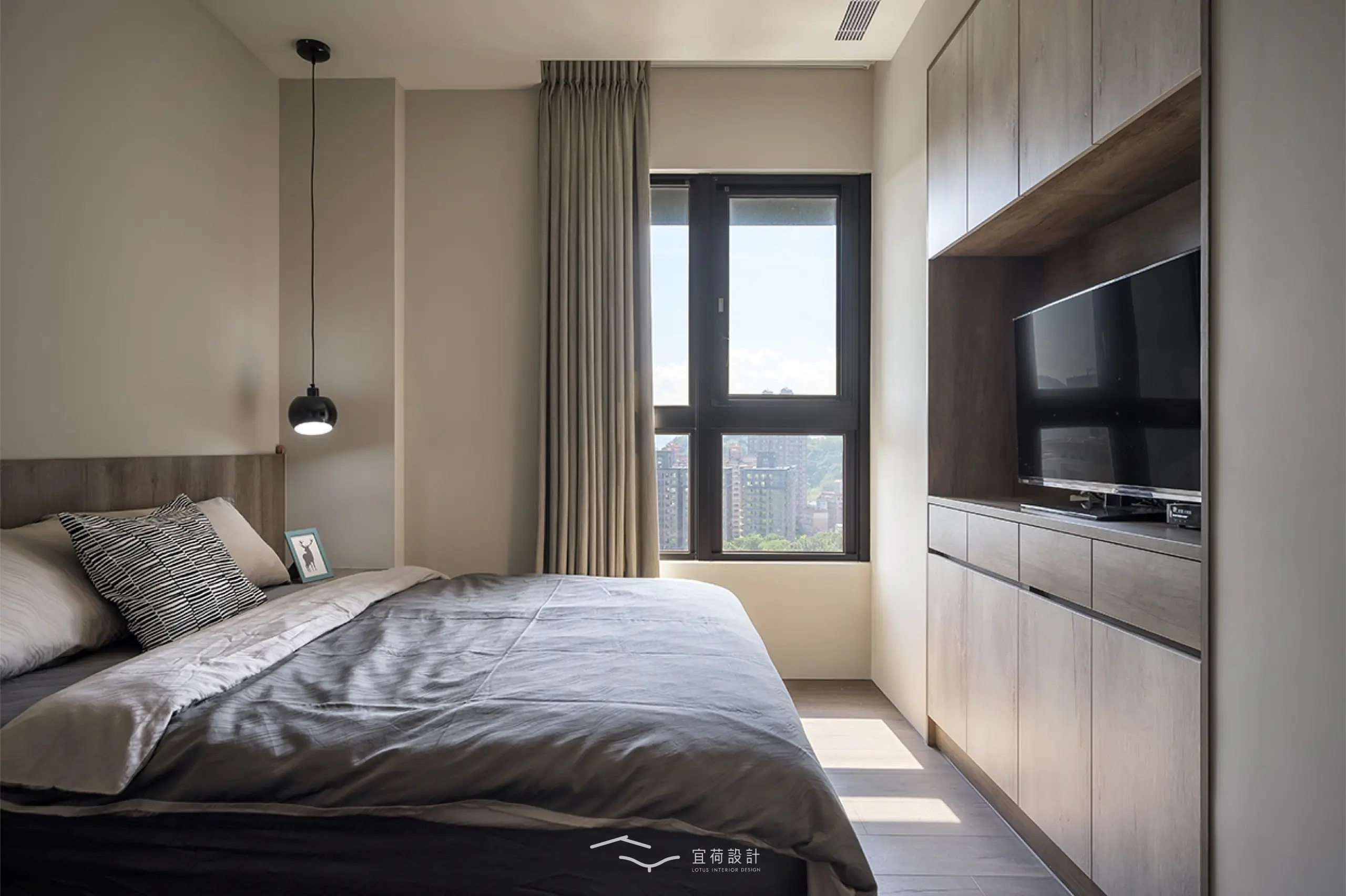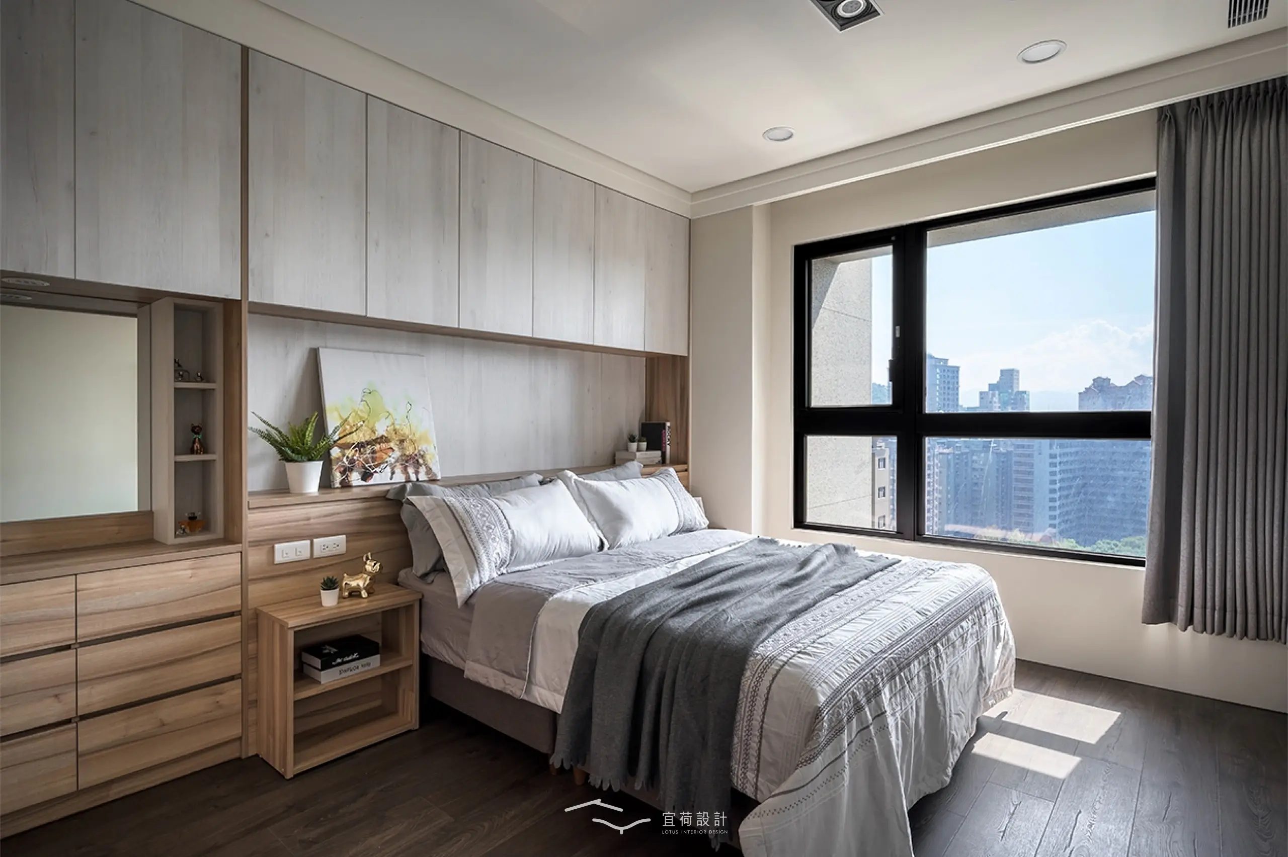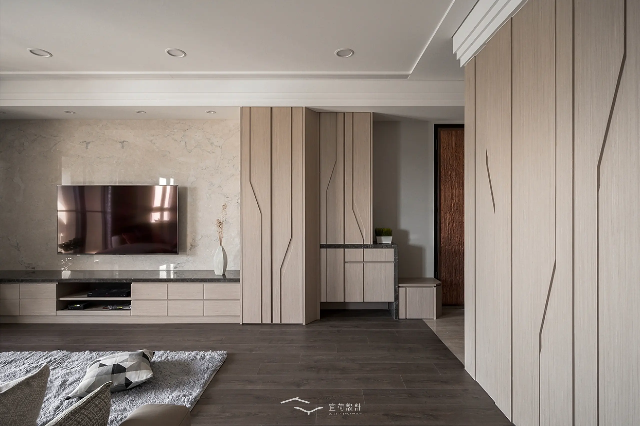 臥室區延續溫潤氛圍,根據不同使用者的生活節奏,安排充足收納與柔和光線,讓休憩成為一種日常的療癒。浴室門則採隱藏式設計,兼顧美學與風水考量。
