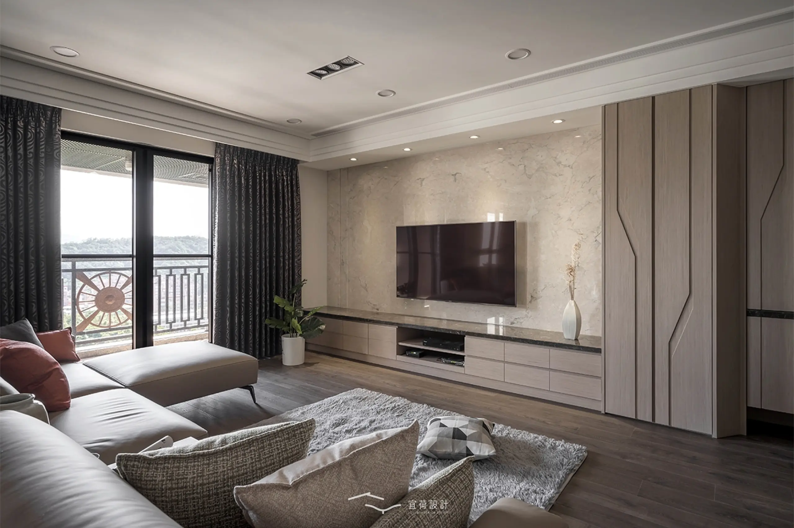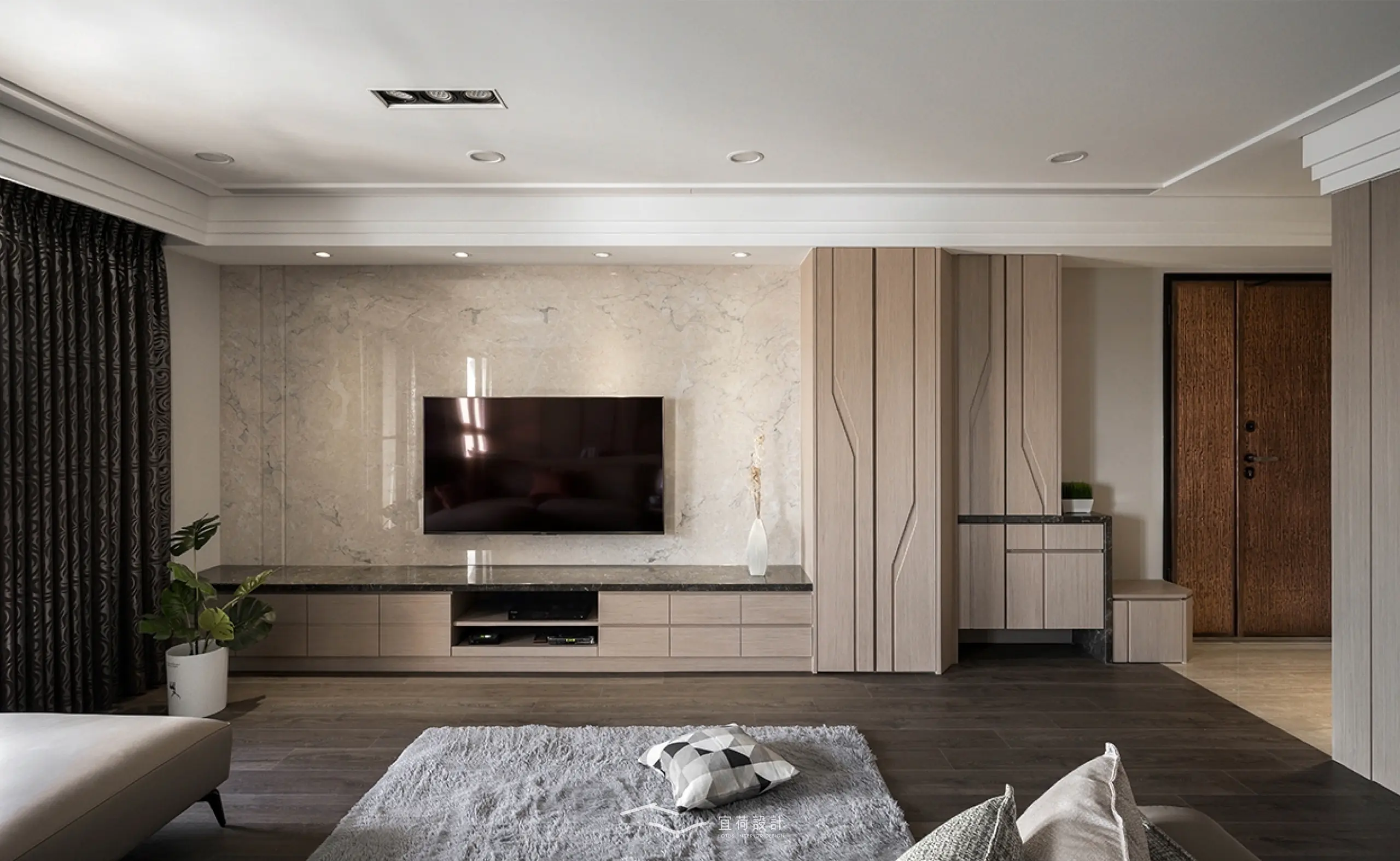 63坪的毛胚屋,原始格局的採光不足、樑壓床、收納空間不足的問題,由設計團隊的悉心調整,空間重新被賦予了呼吸的節奏。原本生硬的空間氛圍,透過溫潤的木質與俐落的大理石質感,融合而成現代人文質感的居家環境。