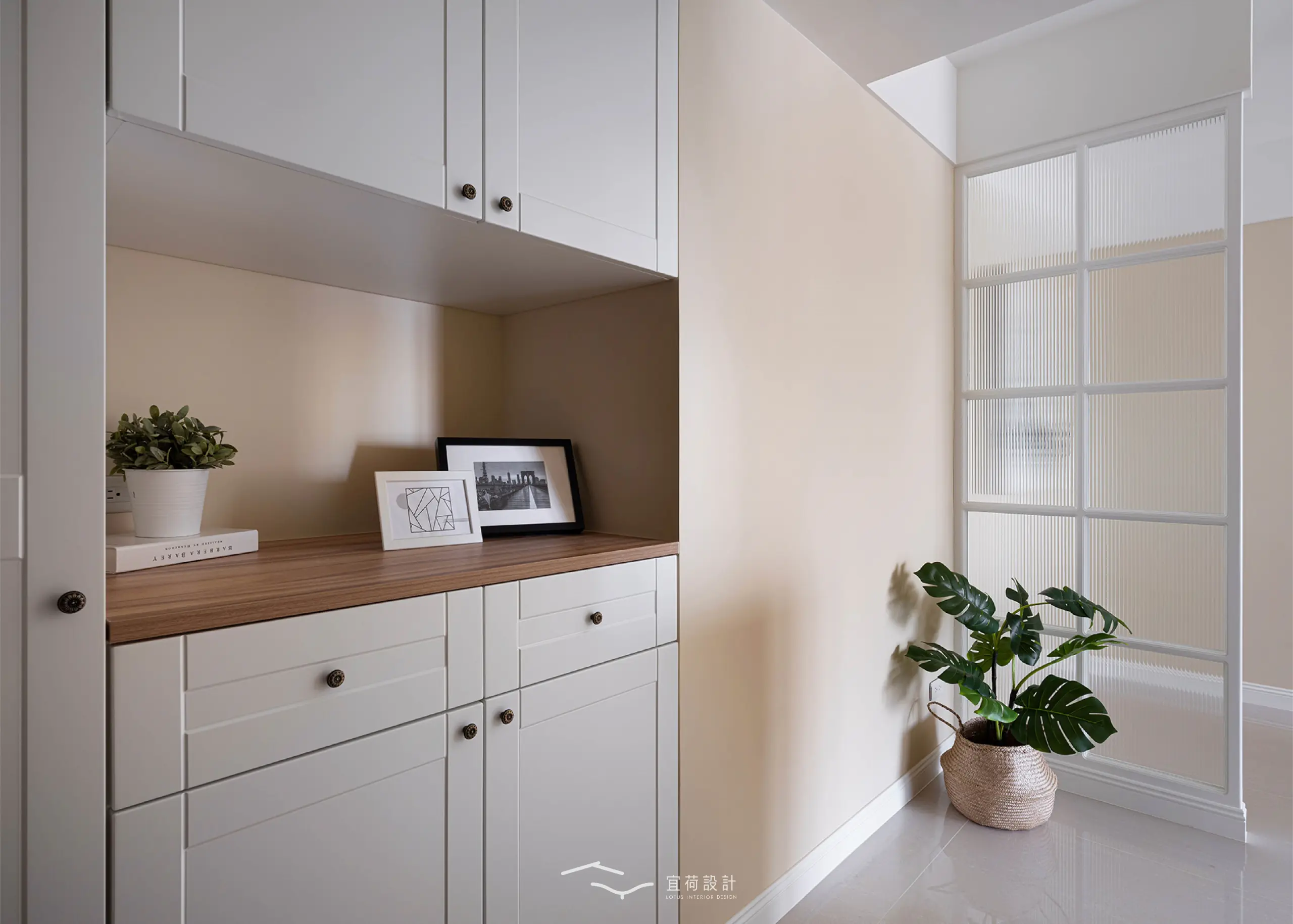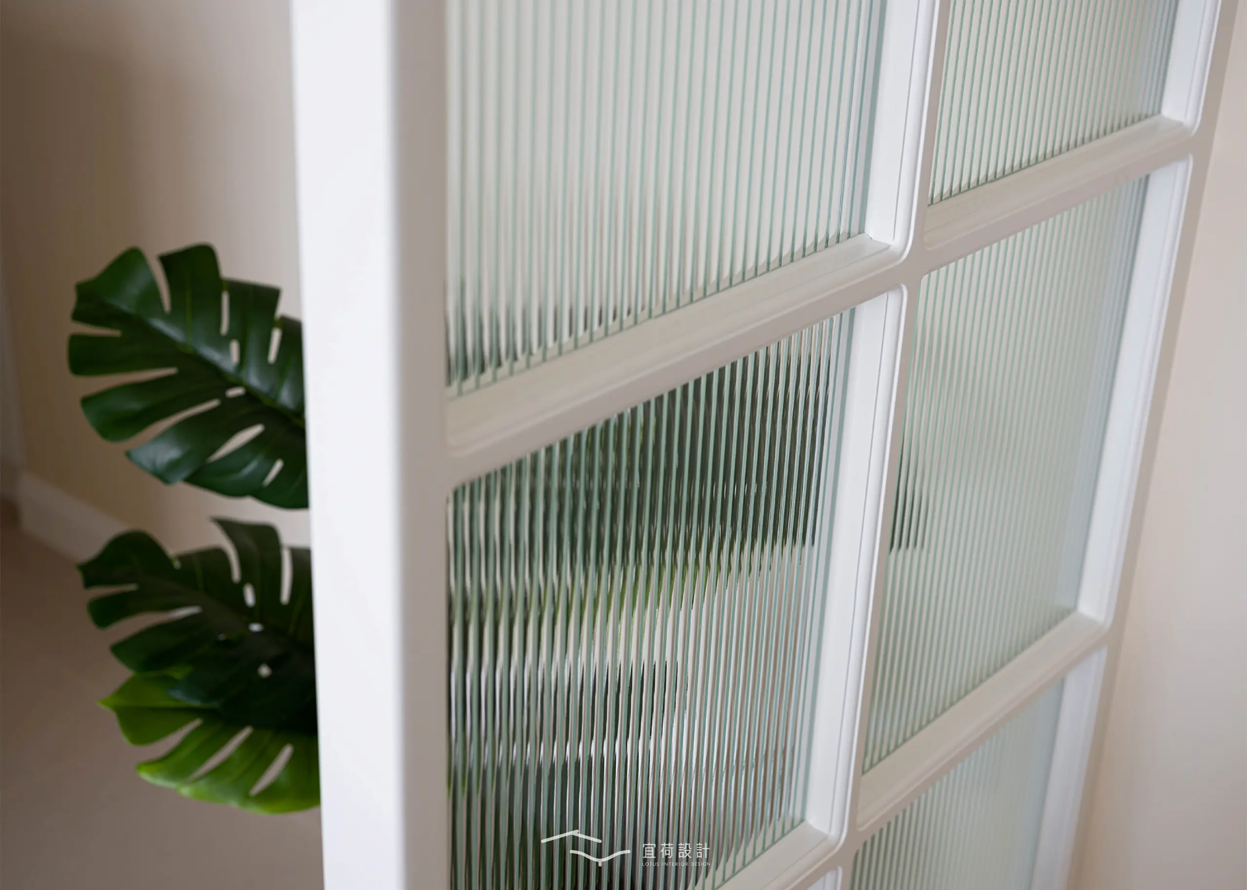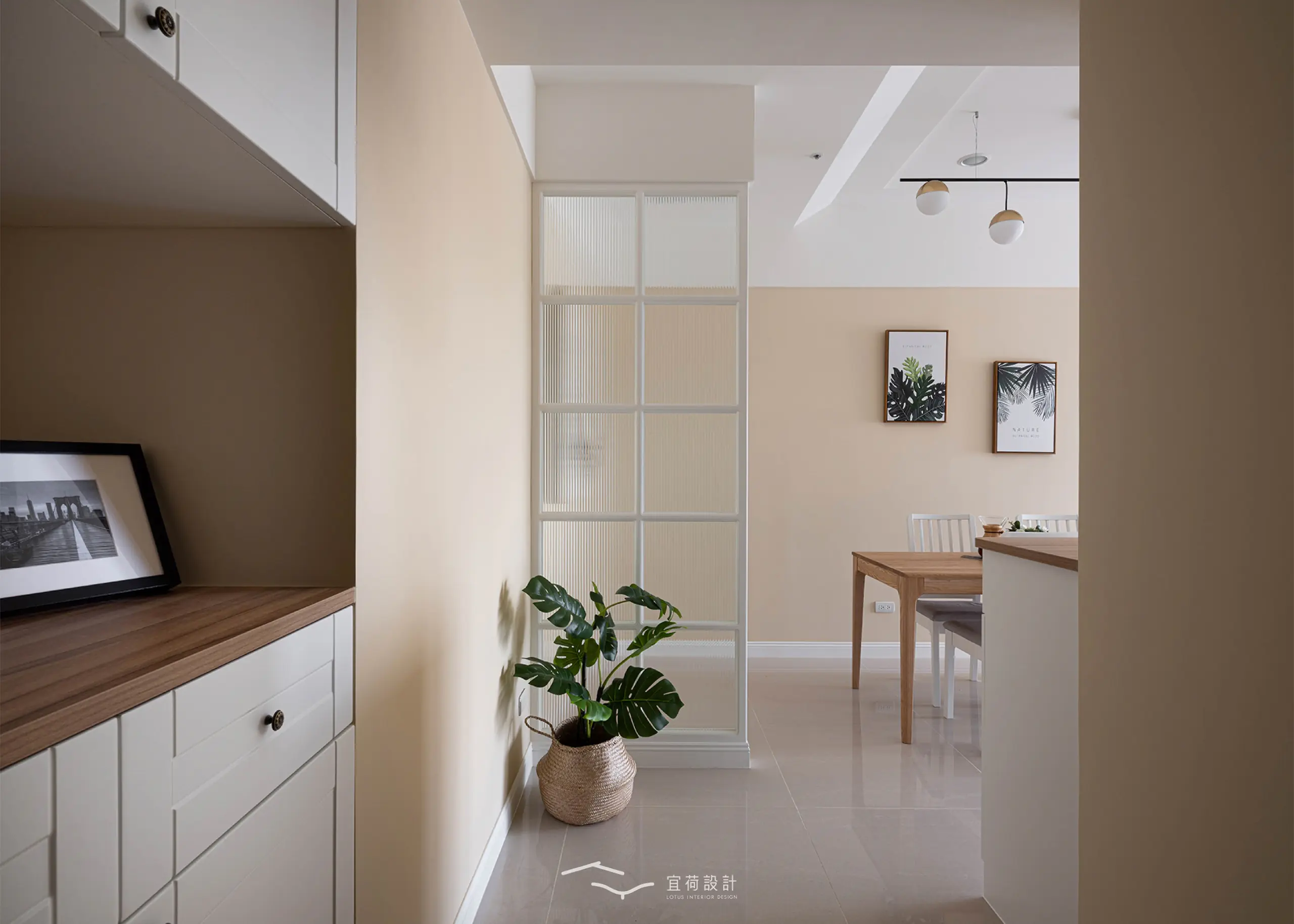 玄關處以屏風結合藝術玻璃,柔化光影層次,也改善了原有的陰暗感,使歸家的第一步就充滿溫度。