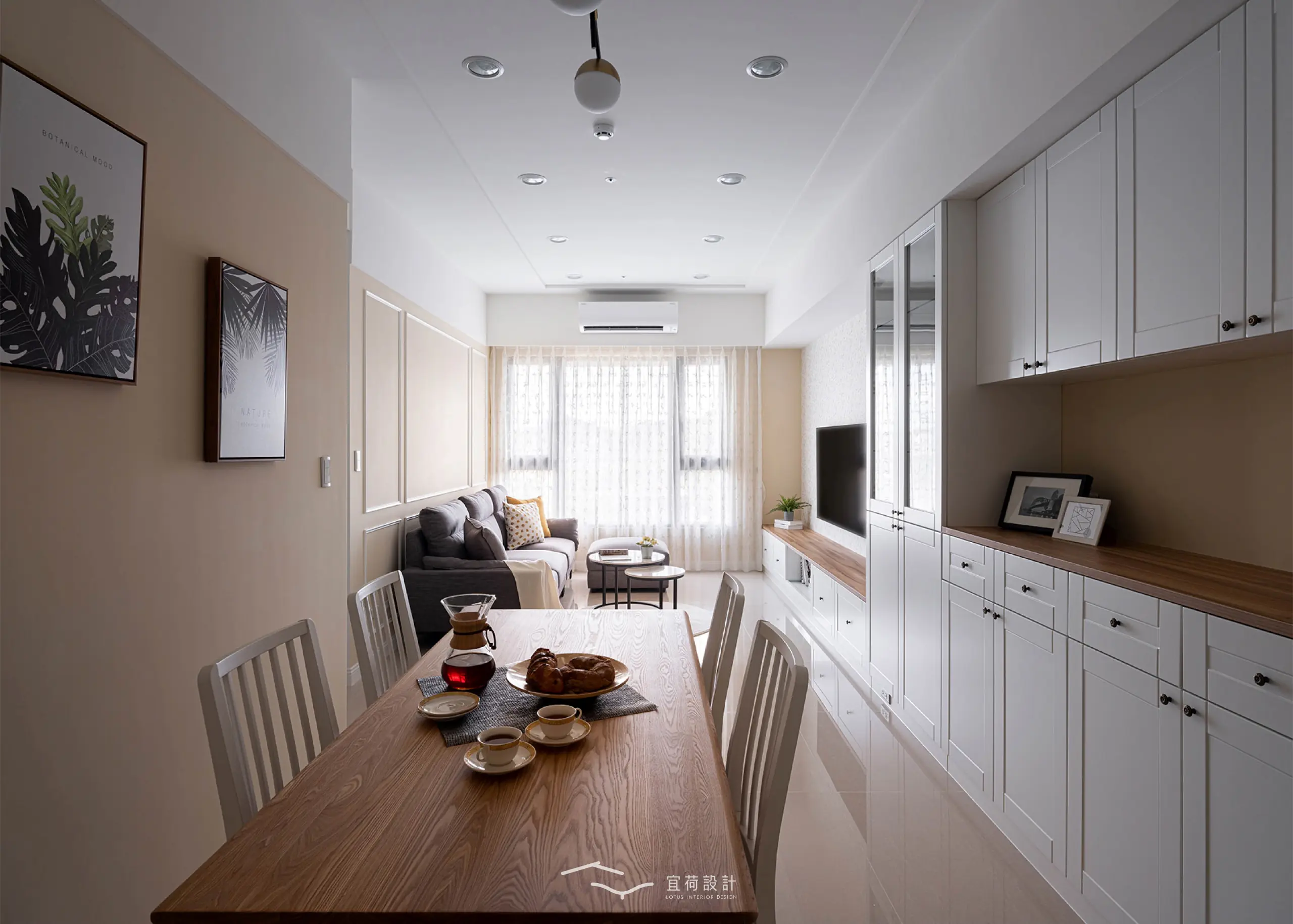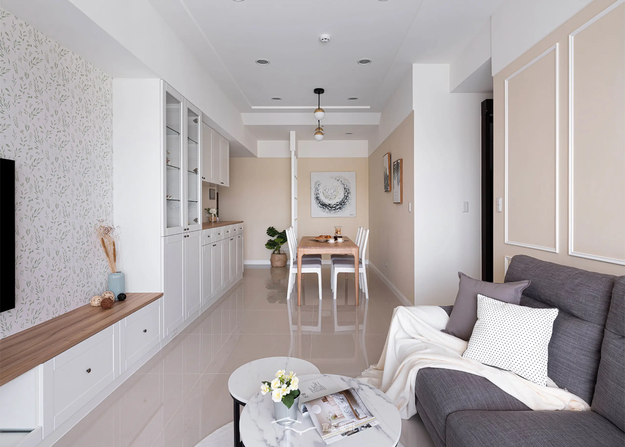 客、餐廳採開放式設計,為讓空間更顯延展,設計團隊利用巧妙設計,讓收納櫃與立面融為一體,放大視覺效果。全室色調以溫潤的清淡色調為基底,猶如陽光般,柔和的點亮空間。而電視牆的植物感圖騰則與簡約的白色線板相呼應,為45坪的新成屋勾勒出優雅輪廓。