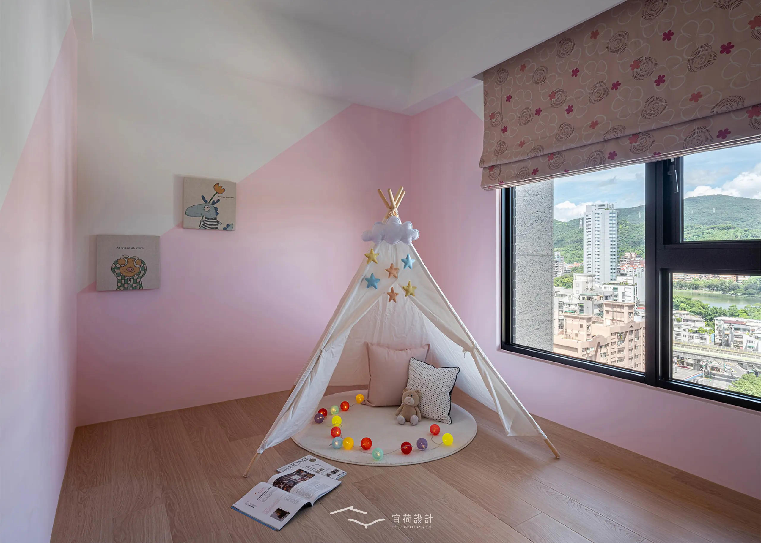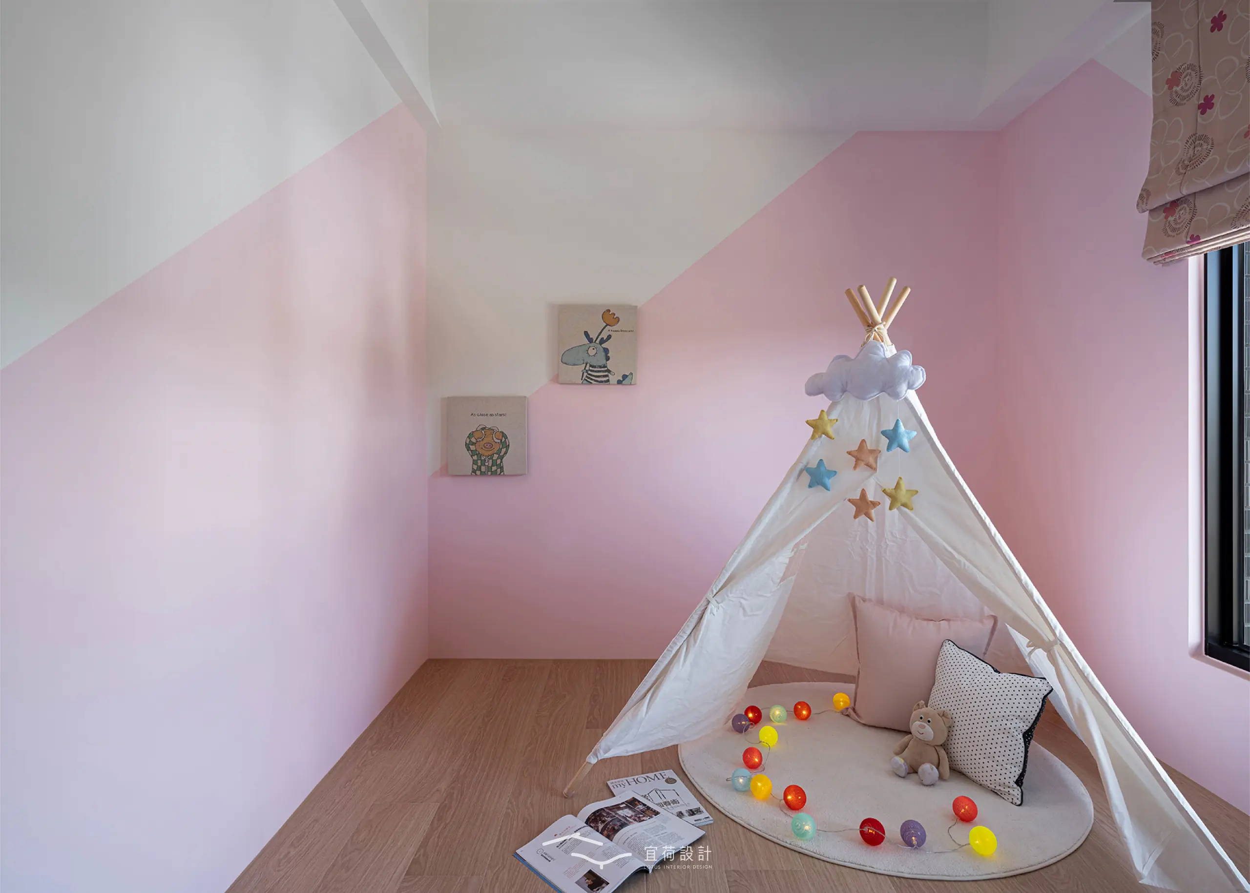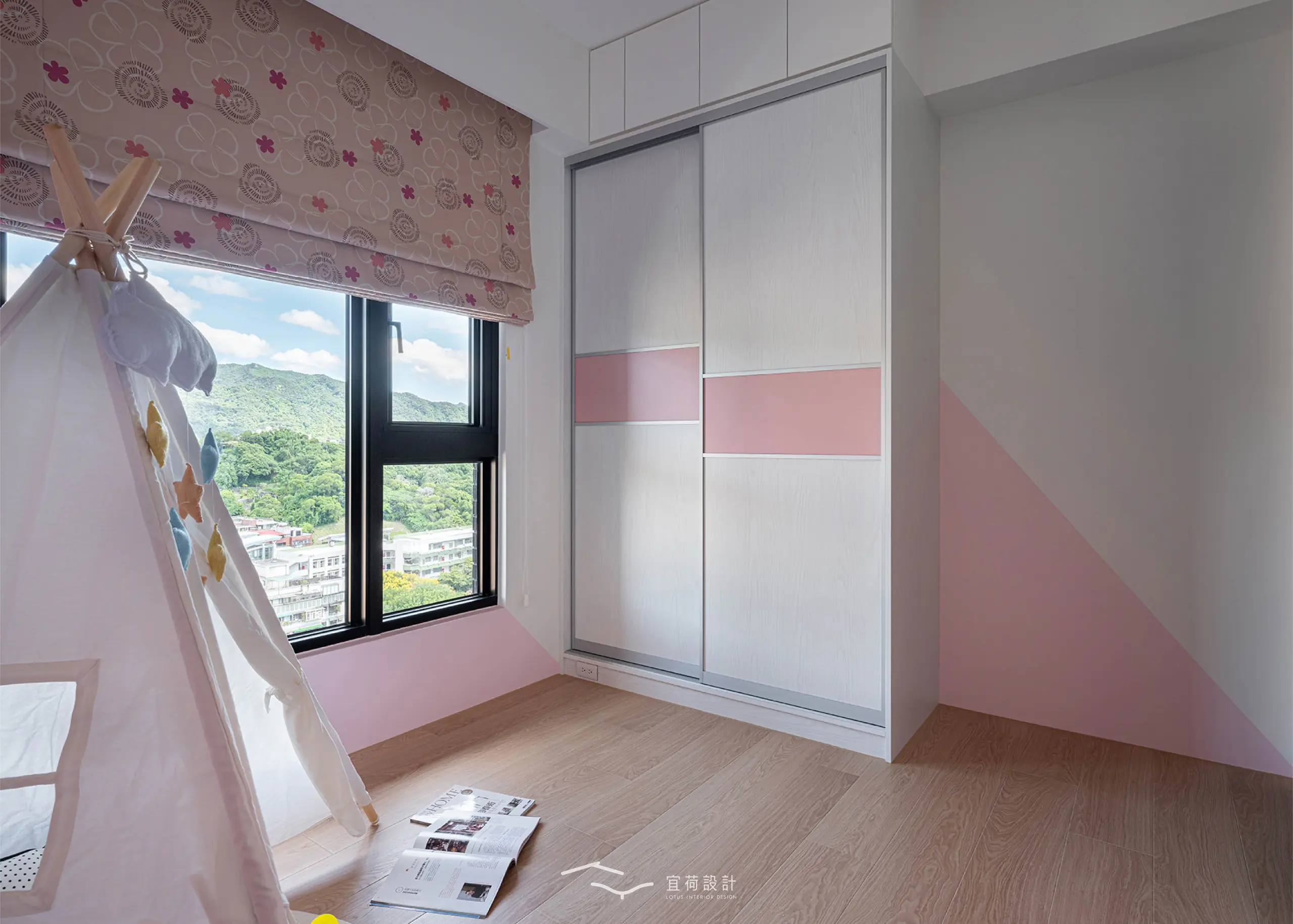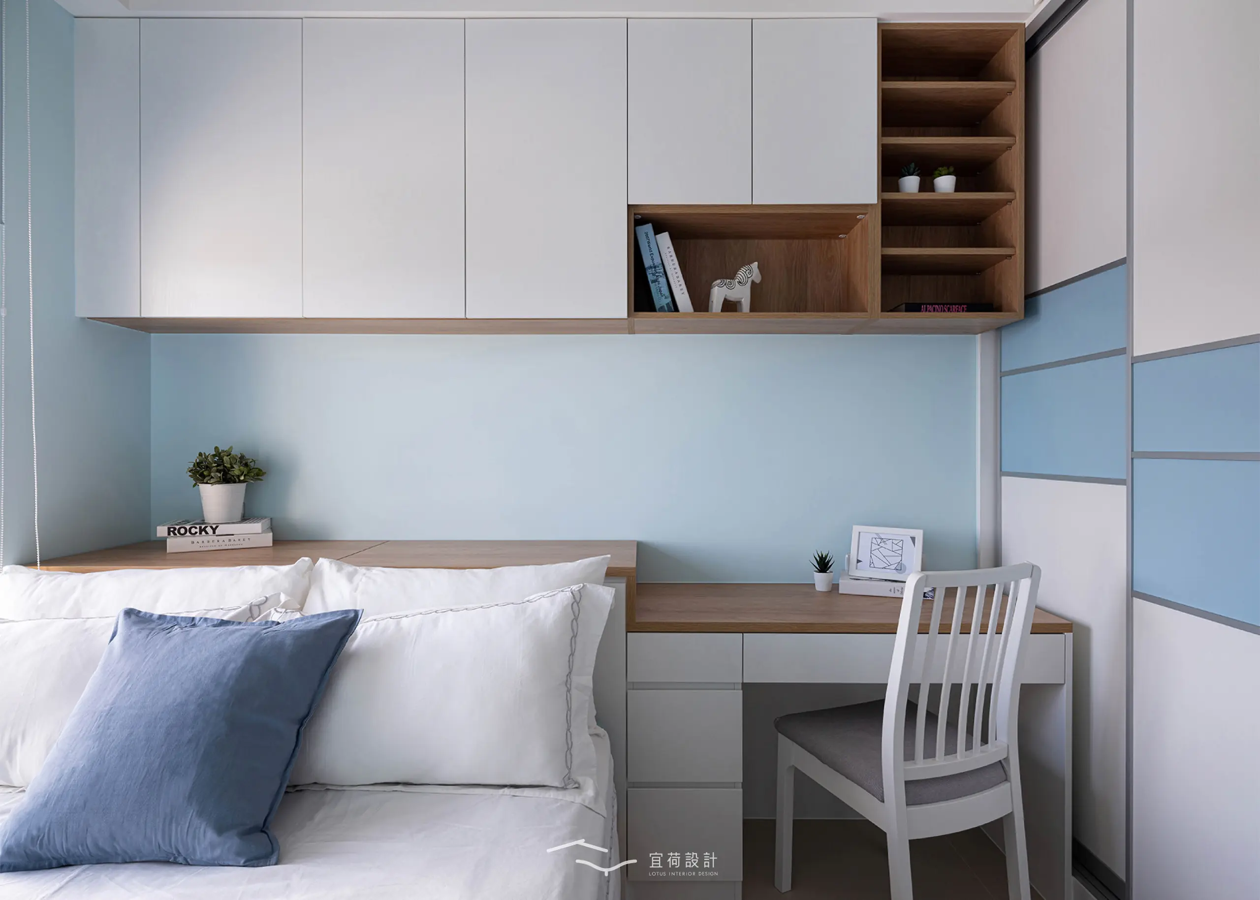 臥室區延續溫潤調性,融入書桌與收納設計,實用與美感並行。男孩房以沉穩藍為底,象徵無限想像與探索。女孩房有別於沉穩調性,以粉與白交織,彷彿春日裡綻放的花,純真又浪漫。