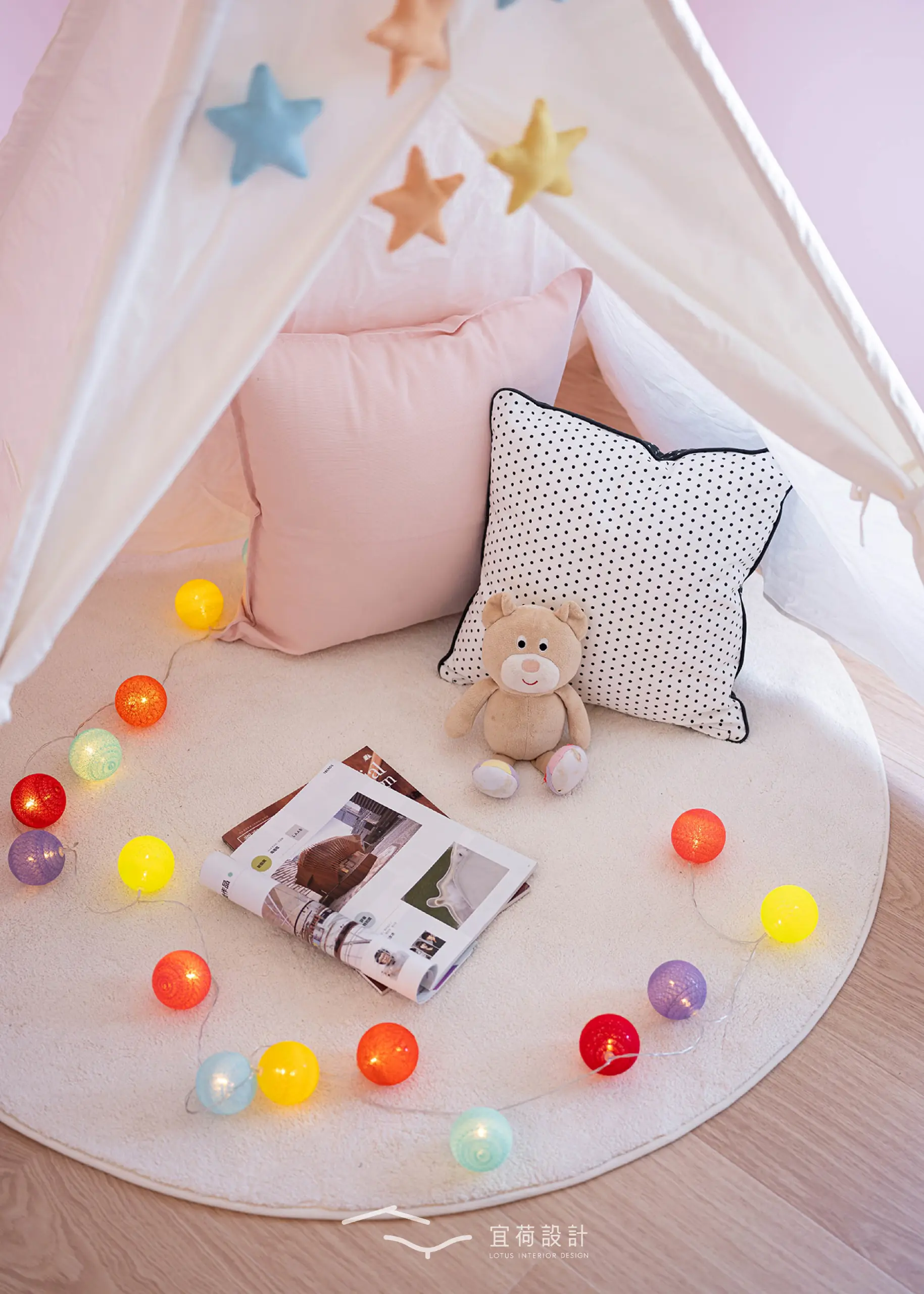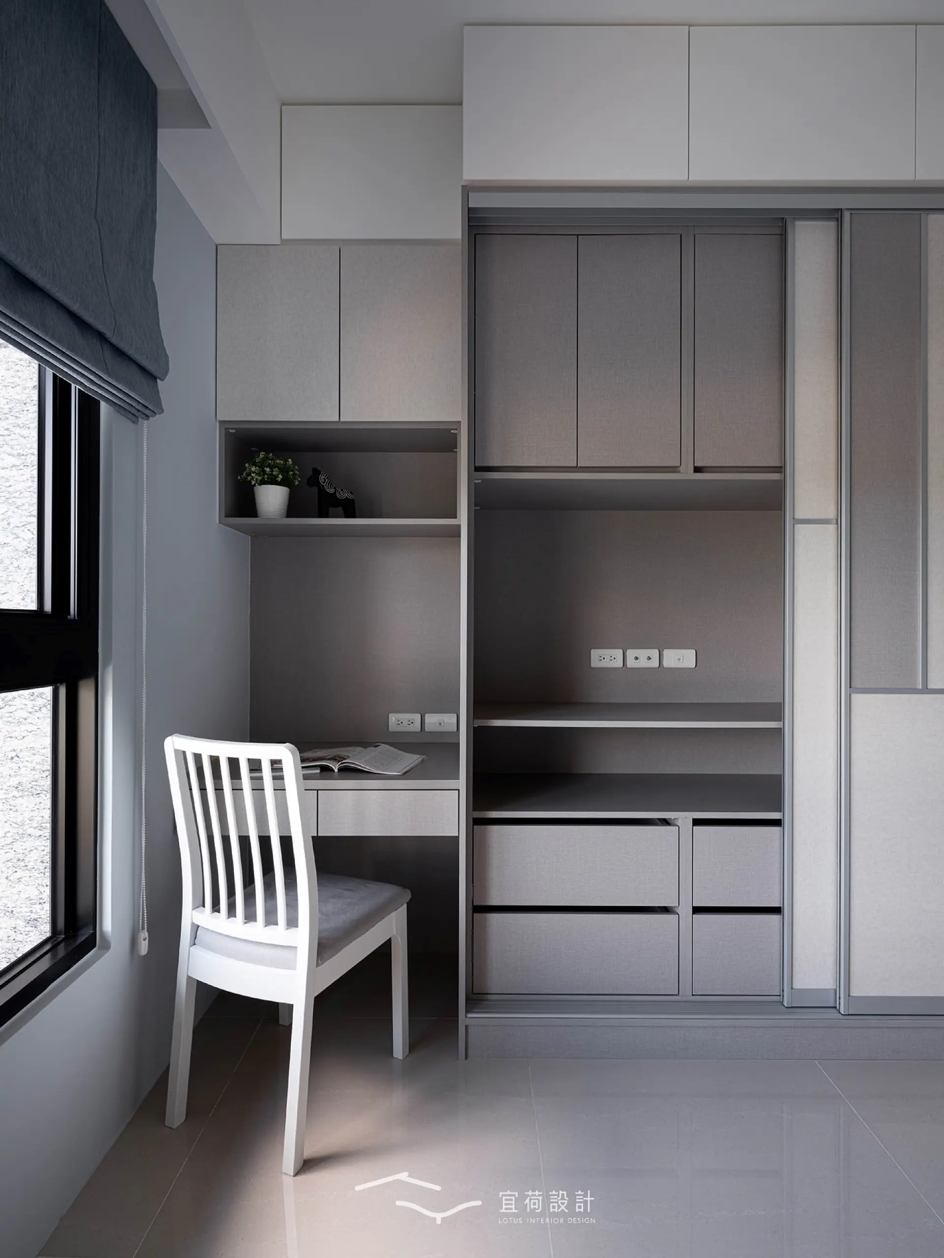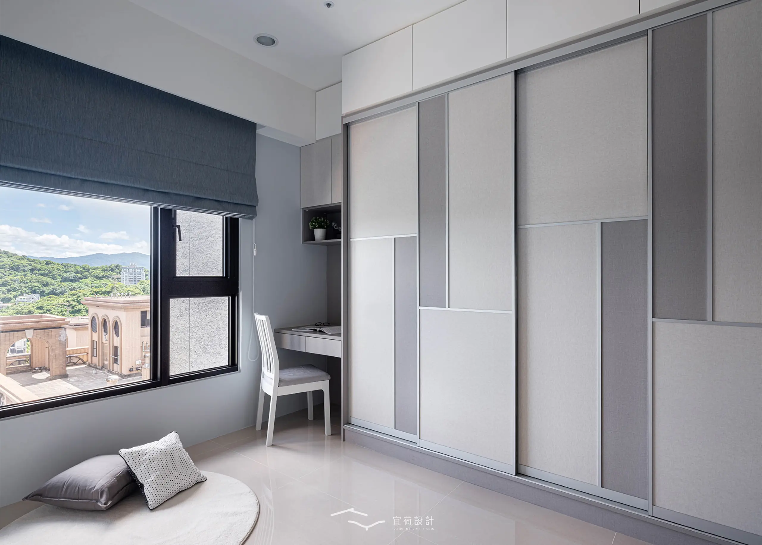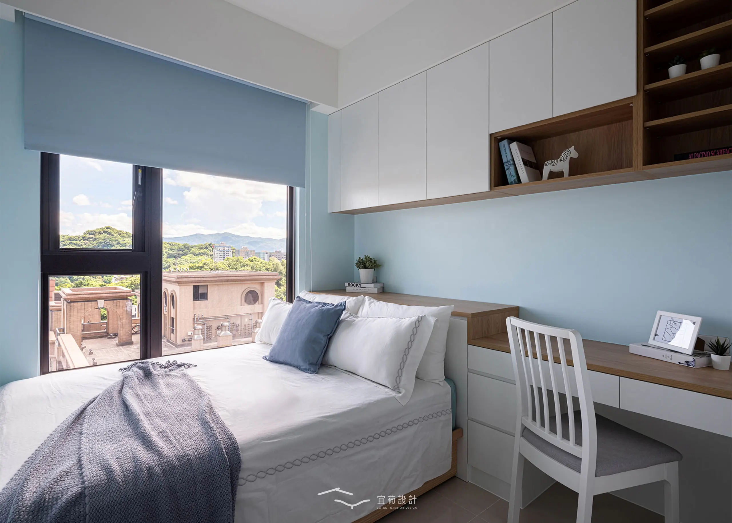 臥室區延續溫潤調性,融入書桌與收納設計,實用與美感並行。男孩房以沉穩藍為底,象徵無限想像與探索。女孩房有別於沉穩調性,以粉與白交織,彷彿春日裡綻放的花,純真又浪漫。